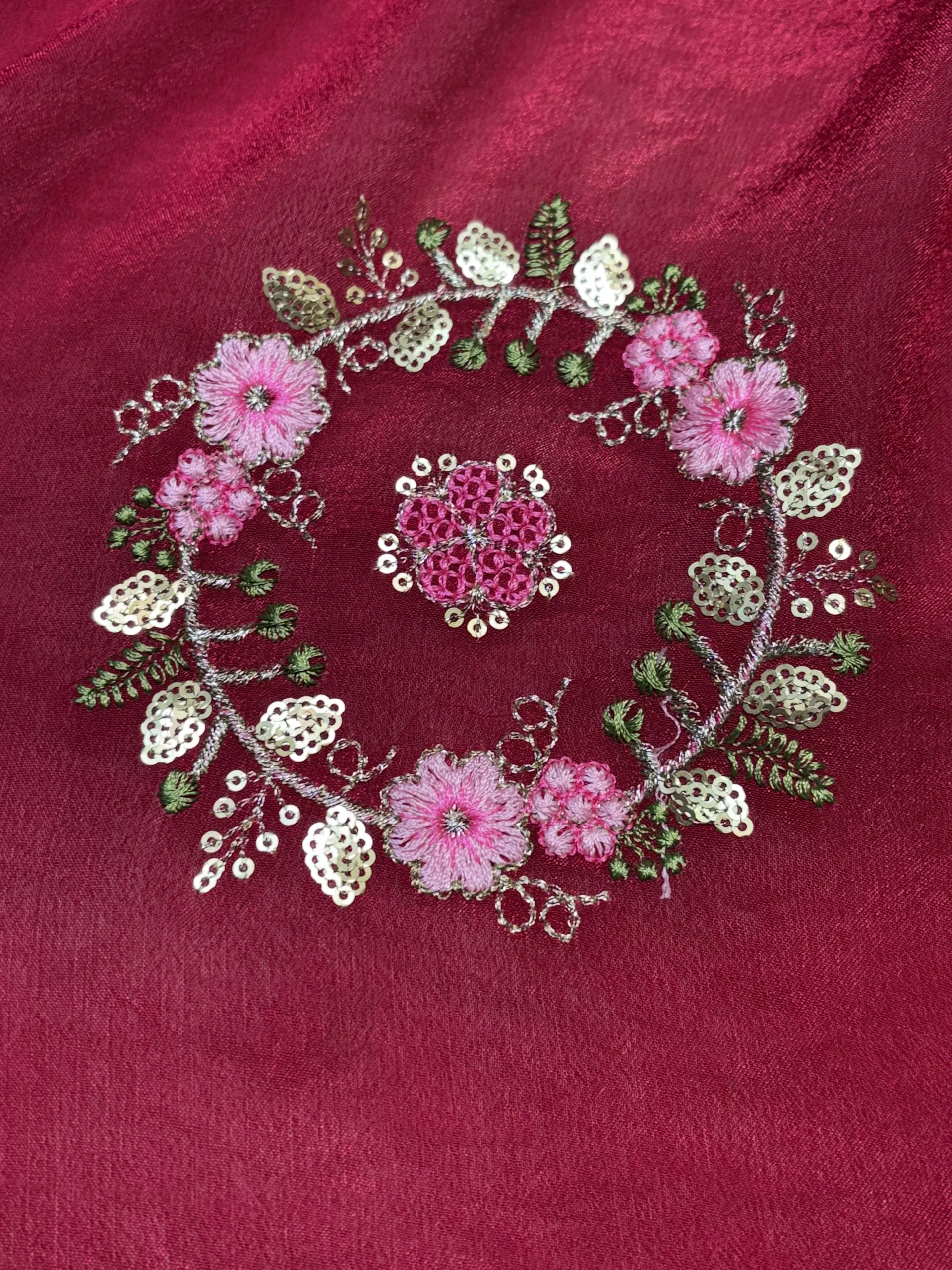 Due to the delicate nature of the Pure Chinon and the intricacy of the Kasida embroidery, it is absolutely essential to Dry Clean Only. Avoid machine washing, wringing, or twisting the fabric, and store it carefully (preferably folded and wrapped in muslin cloth) to protect the fine embroidery threads.
