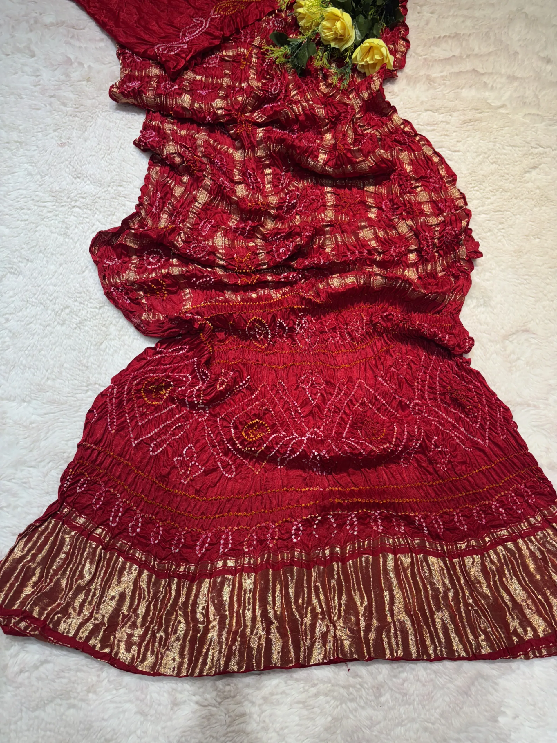 The inherent beauty of the Pure Gaji Silk fabric is its smooth, shimmering texture. This saree may feature [Mention specific work: e.g., subtle Bandhani tie-dye, fine Zari weaving along the border, or elegant foil prints]. Often, the design focuses on clean lines and rich colors to maximize the fabric’s natural lustre and superior drape, creating a look that is both timeless and effortlessly elegant.