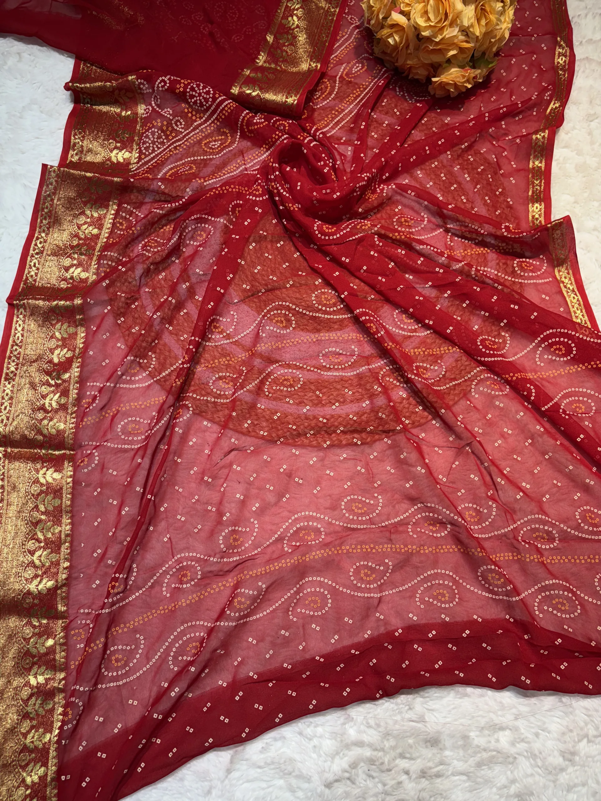 Crafted from a fabric chosen to best showcase the tie-dye brilliance (such as a premium Silk Blend, Georgette, or Kota Silk), this saree offers a vibrant, comfortable, and beautifully flowing drape. The material is specially selected to hold the intense red dye and the intricate Bandhej patterns with clarity, providing a rich look that feels light to wear.