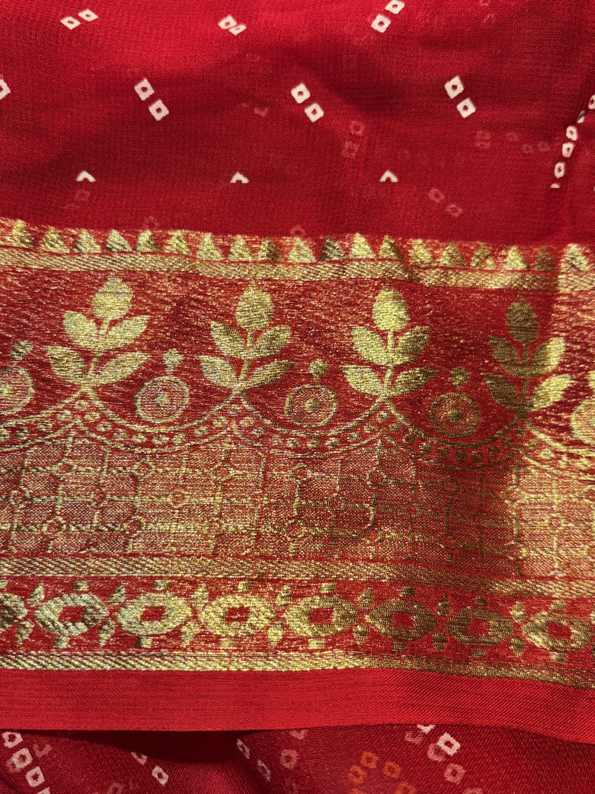 The foundation of this saree is the vibrant Red hue, the color of prosperity and marriage. It is adorned with classic Chunari Bandhej Work, which features a precise arrangement of small, hand-tied knots that create distinct, traditional patterns (often featuring dots, squares, or Leheriya waves). The Bandhej work provides a subtle, beautiful texture across the fabric, ensuring a sophisticated traditional appearance that is steeped in heritage.