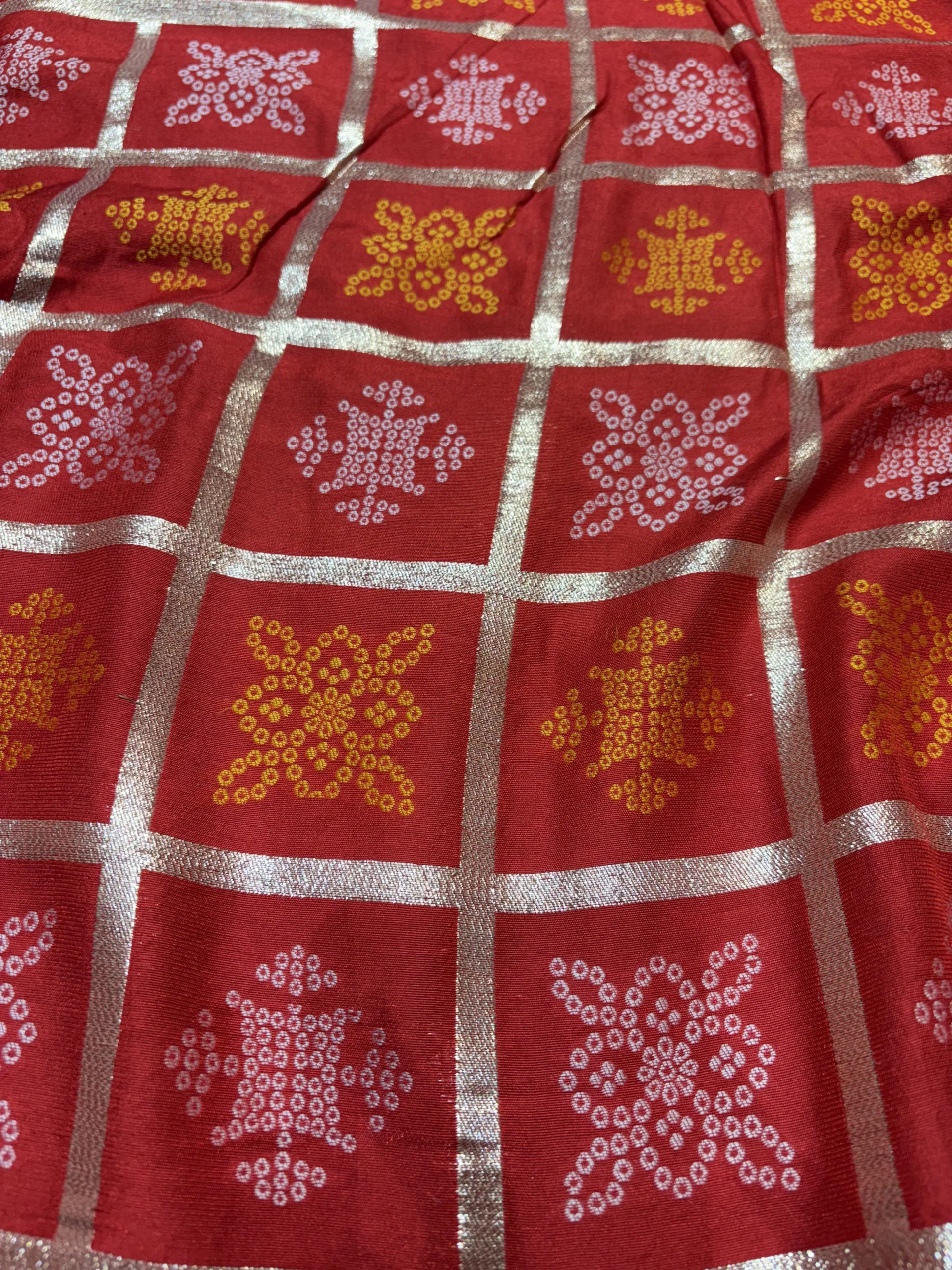 Crafted from a premium fabric traditionally used for Ghatchola (often a fine Silk Blend or Gaji Silk), this saree is entirely Handloom woven. This ensures superior quality, a distinct structured texture, and a rich, luxurious drape. The material is strong enough to hold the vibrant red dye and the intricate Bandhej patterns with absolute clarity, making it comfortable yet regal.