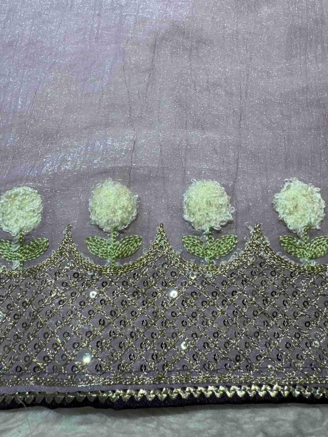The tissue fabric beautifully highlights the thread embroidery, giving the saree a luxurious yet airy feel.