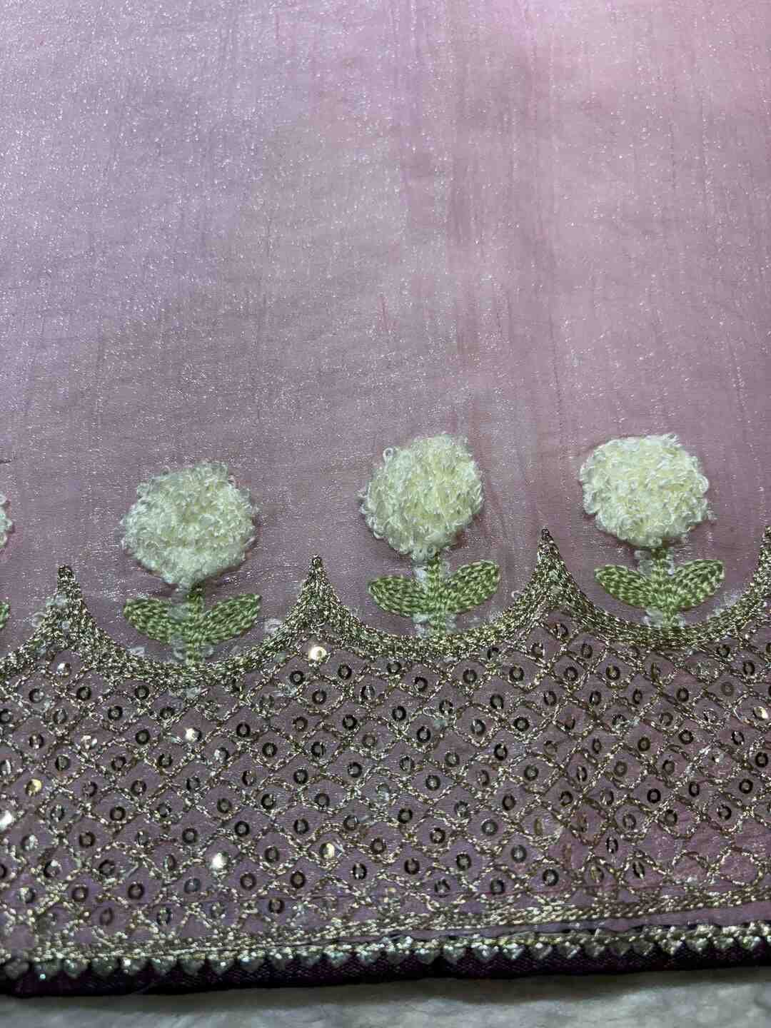 A stunning fusion of artistry: Delicate thread work adorns the shimmering Tissue fabric, creating a lightweight, refined drape that feels graceful, festive, and effortlessly luxurious.