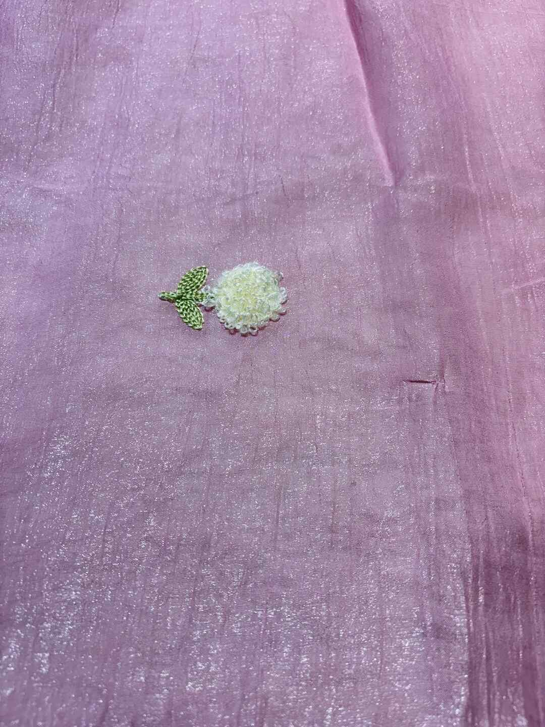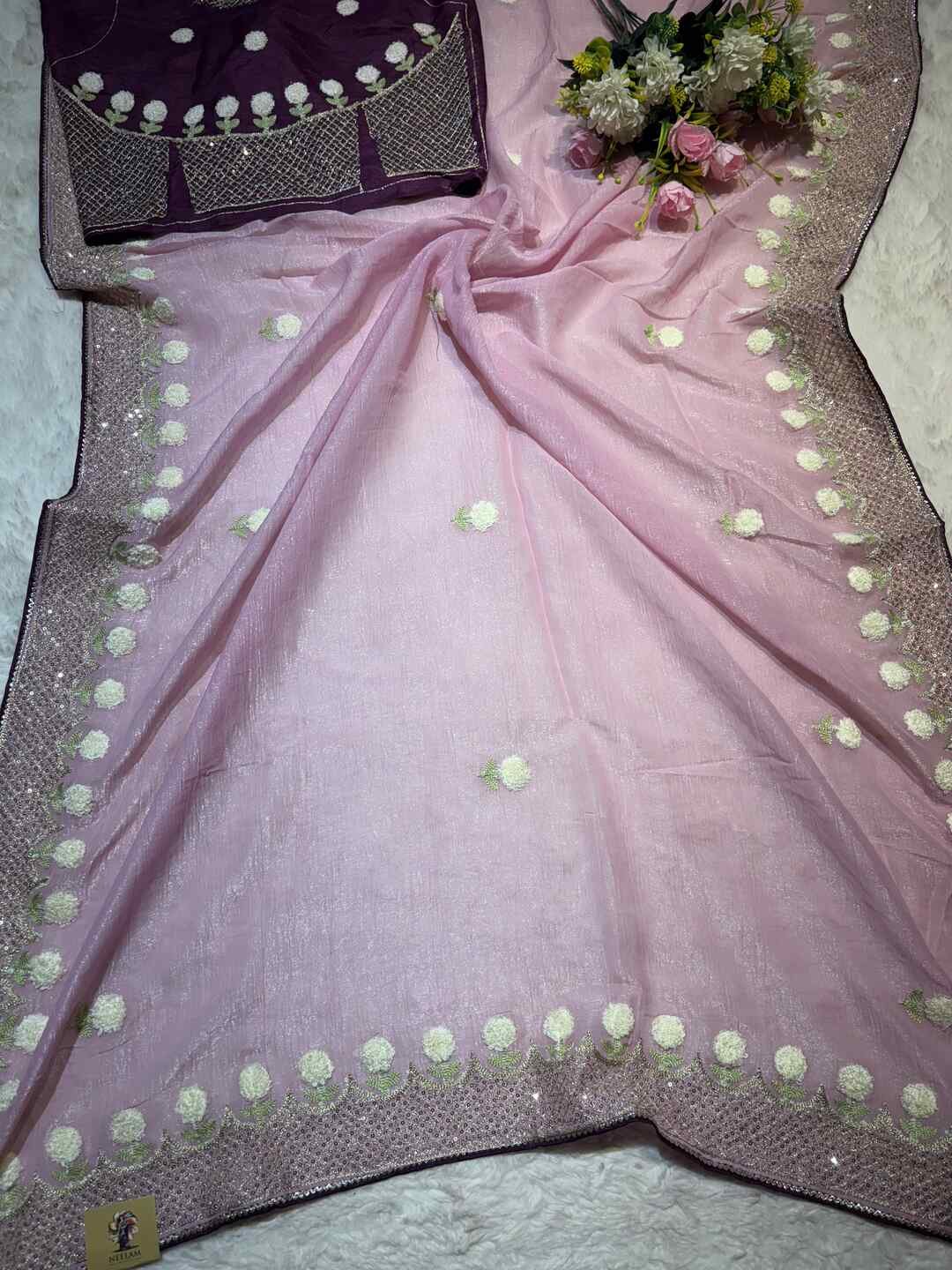 The tissue fabric beautifully highlights the thread embroidery, giving the saree a luxurious yet airy feel.