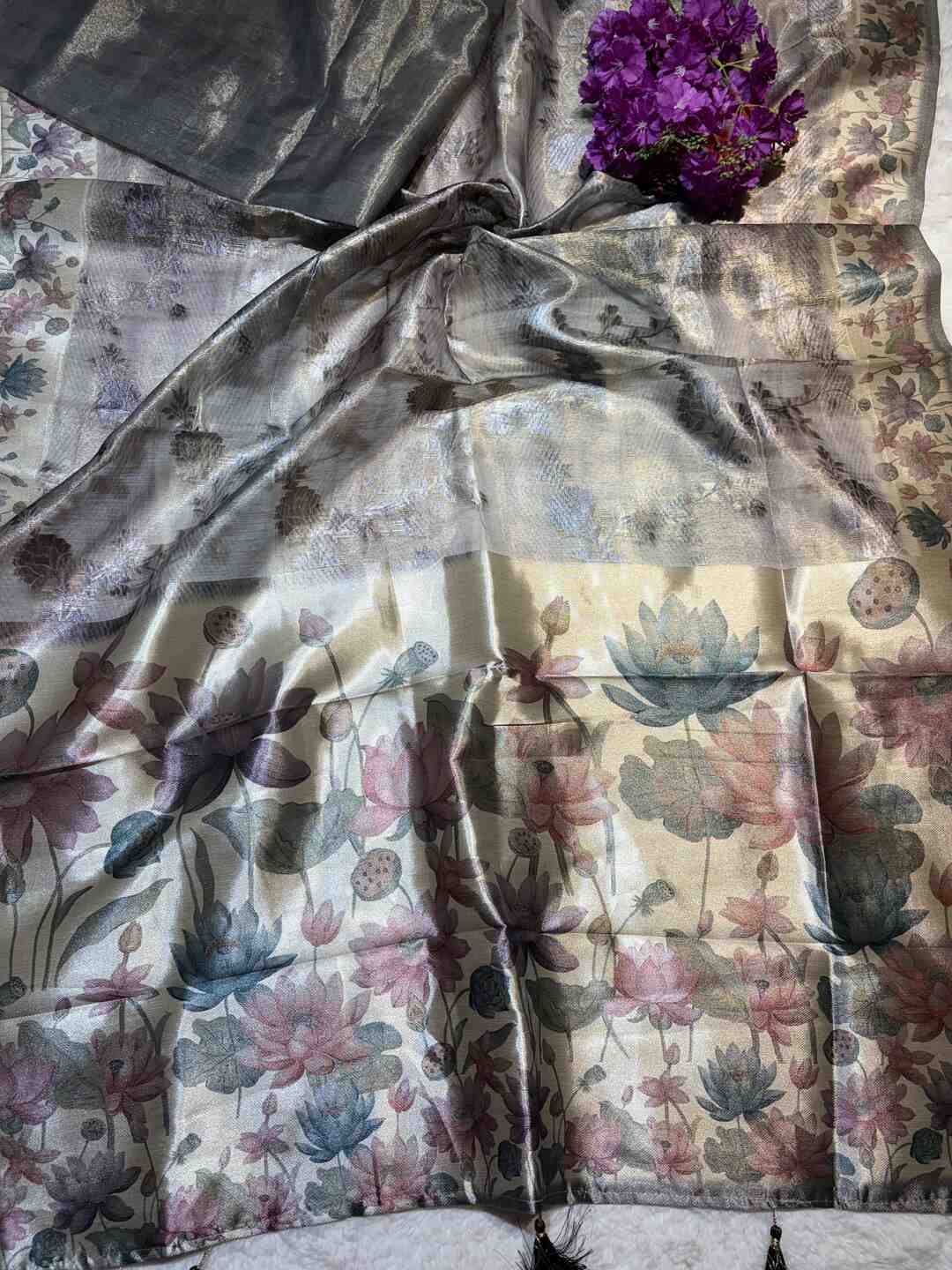 The all-over digital print combined with tissue shimmer creates a classy, trendy, and eye-catching saree.