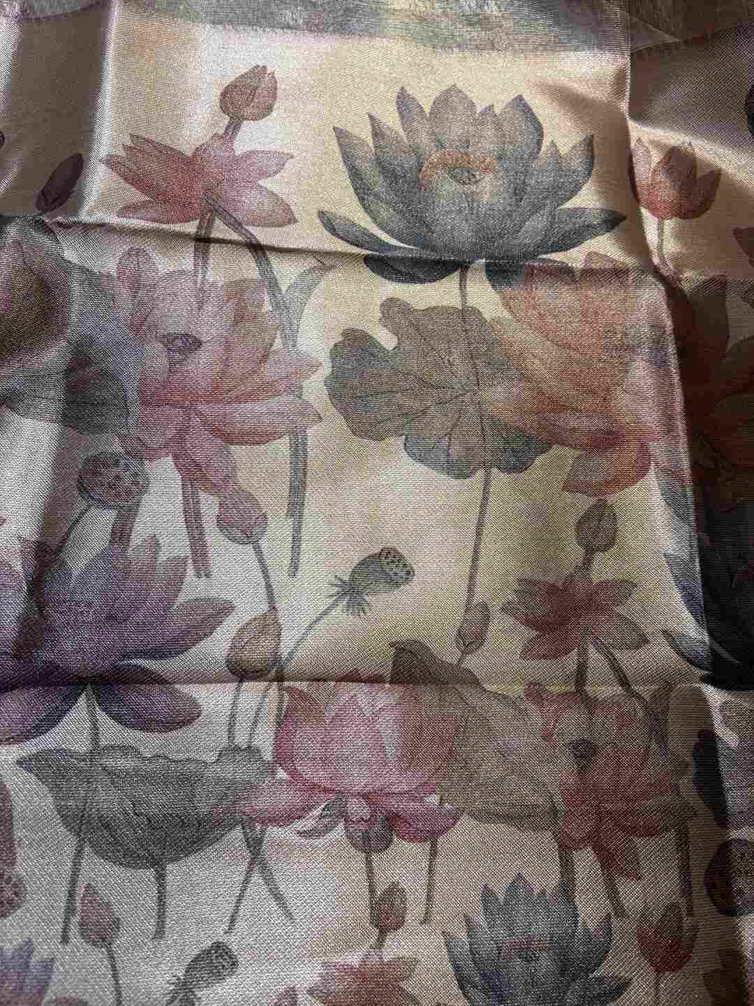 The tissue fabric adds a luxurious glow, making the digital prints stand out beautifully.