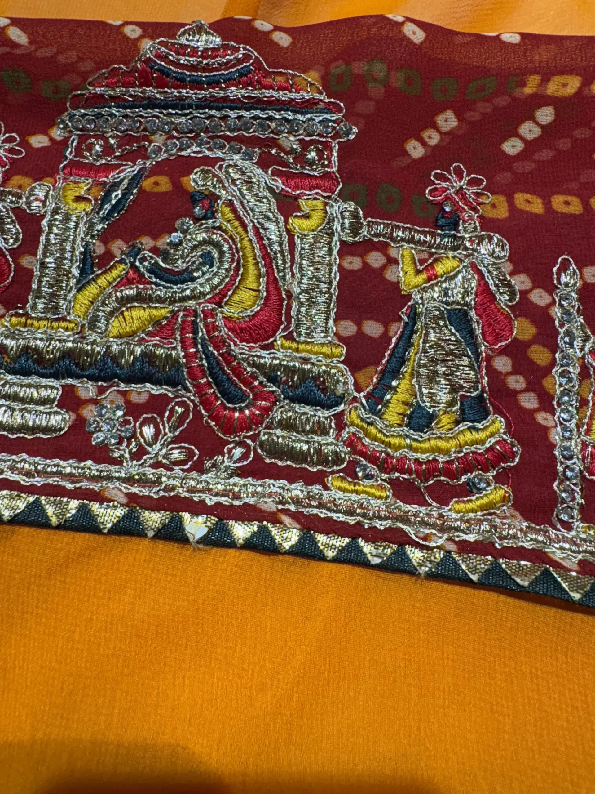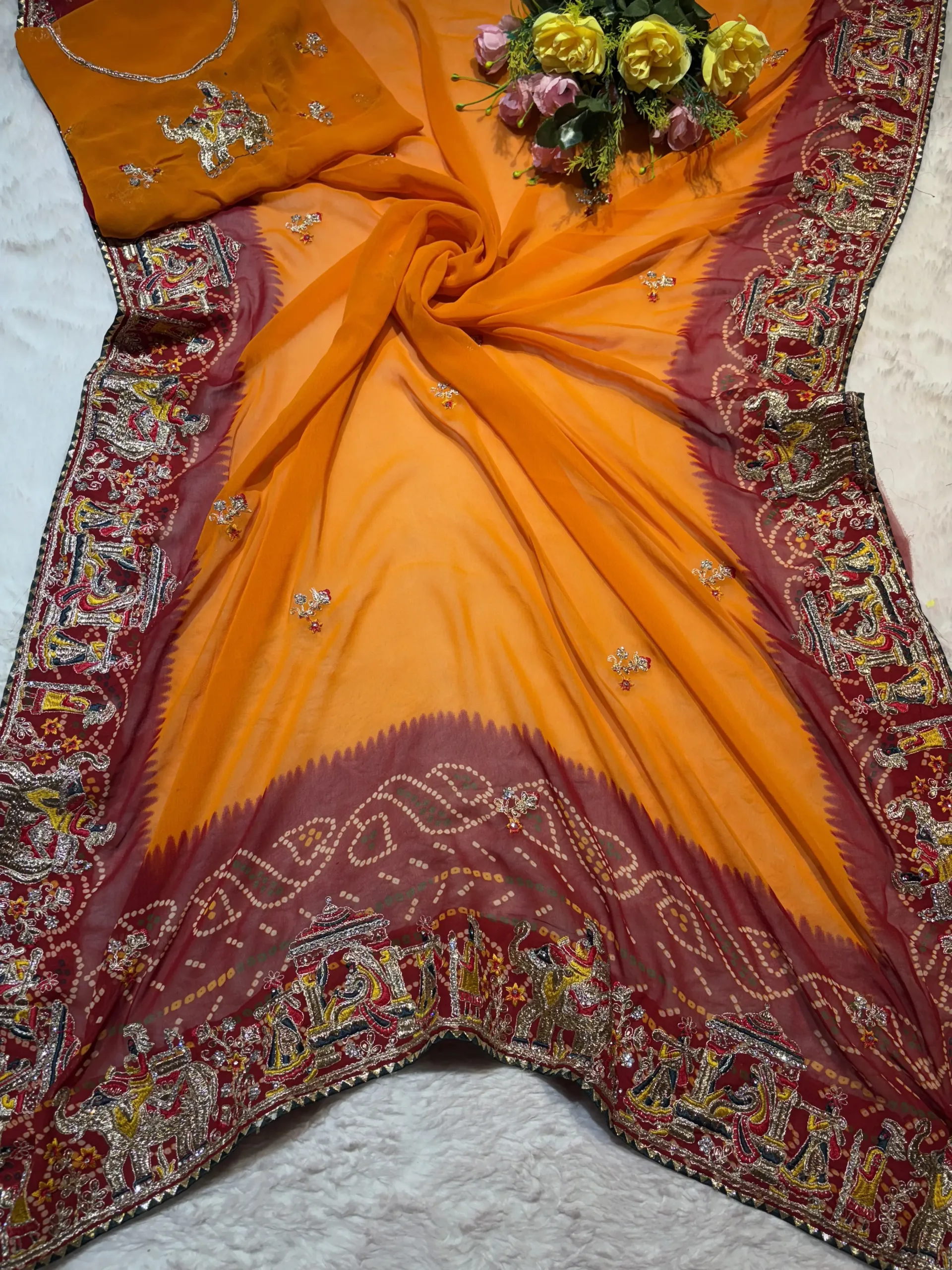 The saree features the signature, auspicious Pilla (Yellow/Saffron) color—a shade deeply significant in Marwadi culture, representing prosperity, new beginnings, and devotion. It showcases authentic Bandhani (tie-dye) work, characterized by precise, tiny, hand-tied dots and traditional motifs. The use of soft Georgette ensures the Bandhani pattern is clearly displayed while giving the saree a modern, sophisticated flow that traditional heavier silks cannot match.