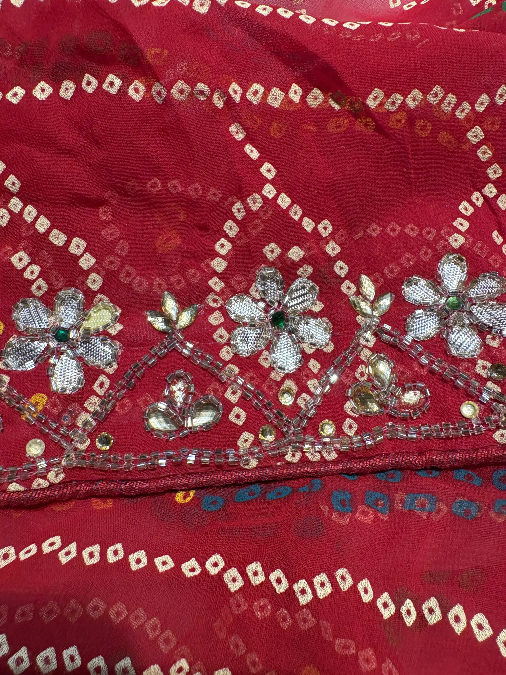 This saree offers a perfect blend of traditional craft and modern luxury. The authentic Bandhej provides deep cultural roots, while the labor-intensive All Over Karadana Work ensures a bespoke, highly glamorous finish. The exclusive NEELAM TRADERS new launch guarantees superior quality, vibrant dye retention, and an undeniably luminous, heirloom-quality presence. It comes with an unstitched matching/complementary blouse piece.