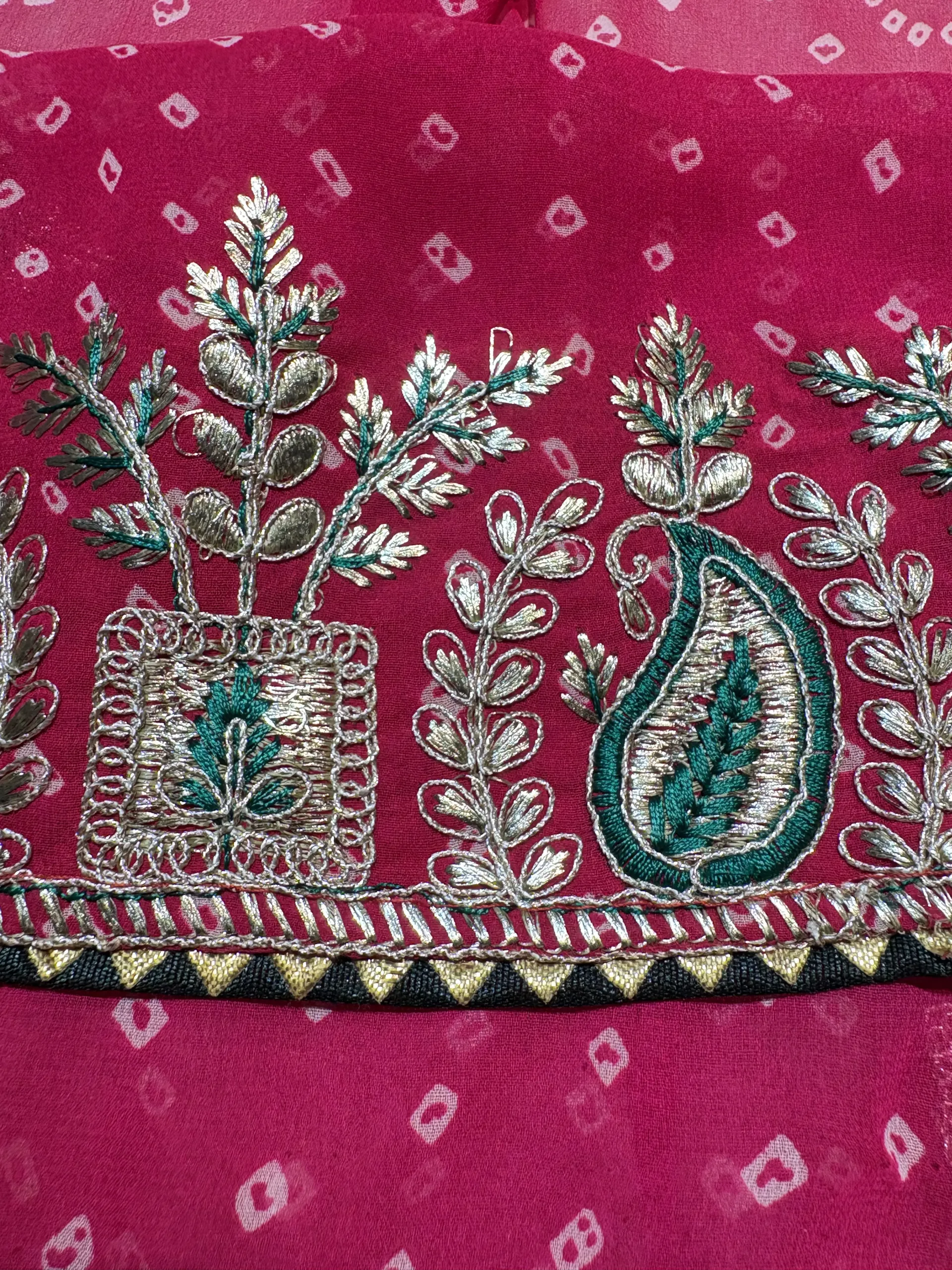 To maintain the vibrant traditional dyes and the integrity of the hand-tied Bandhej knots, it is strictly recommended to Dry Clean Only. Avoid machine washing and twisting the fabric to preserve its unique texture and color richness.