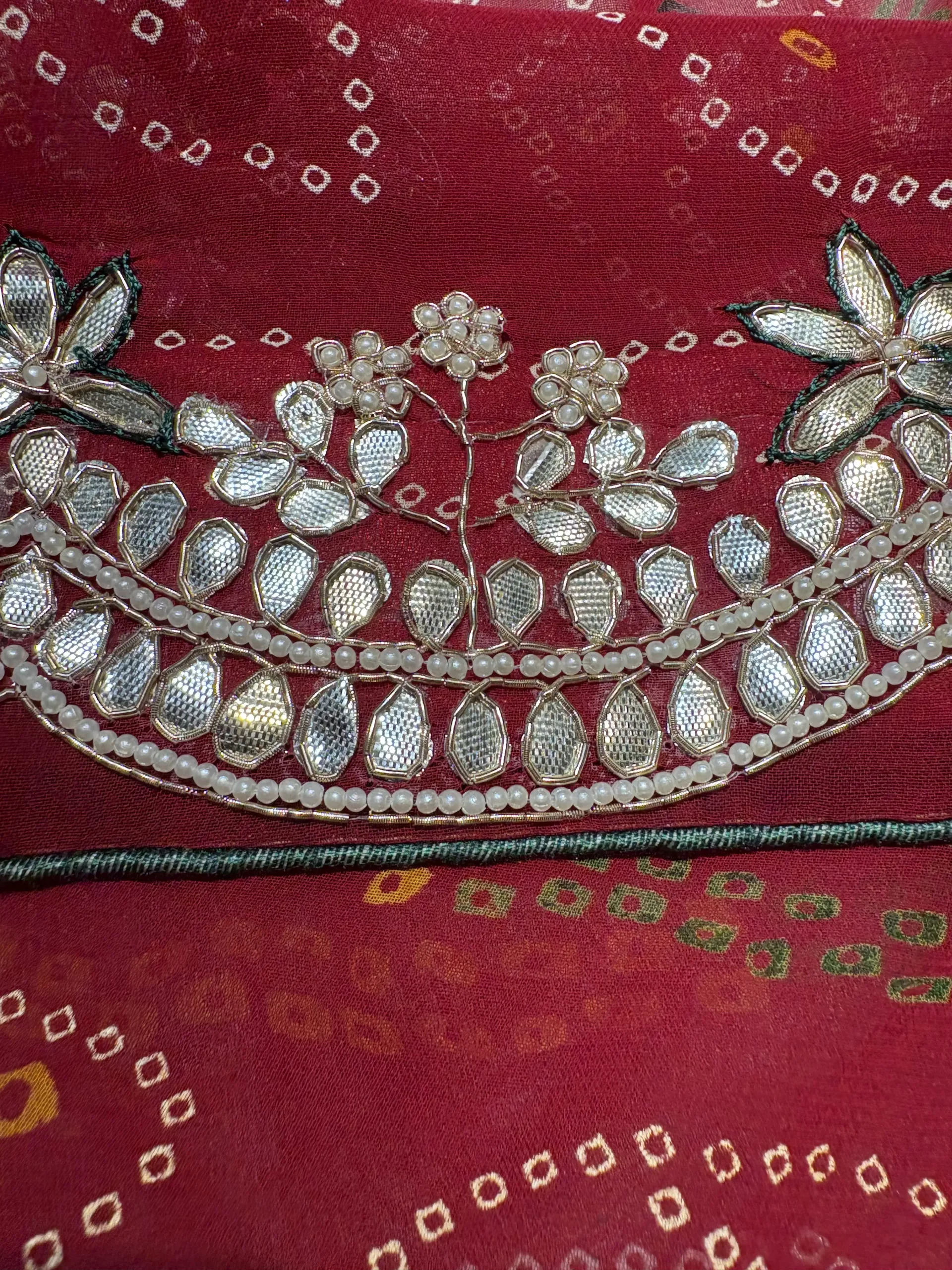 Experience the luxury of heritage. The vibrant Red Bandhej is stunningly overlaid with All Over Hand Gota Patti, ensuring an opulent, unforgettable, and traditional drape.