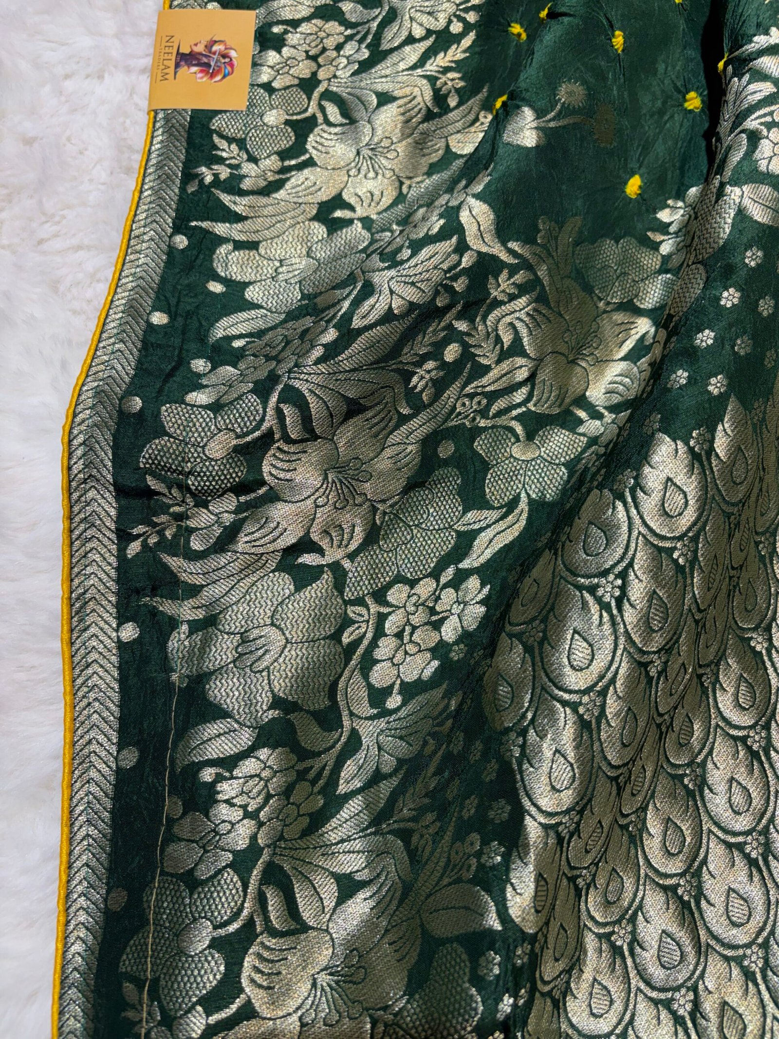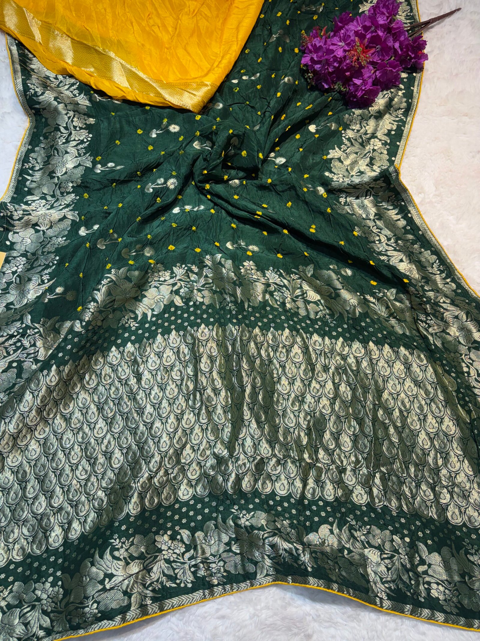 The fusion of Banarasi elegance and Bandhej craftsmanship creates a timeless and eye-catching ethnic masterpiece.