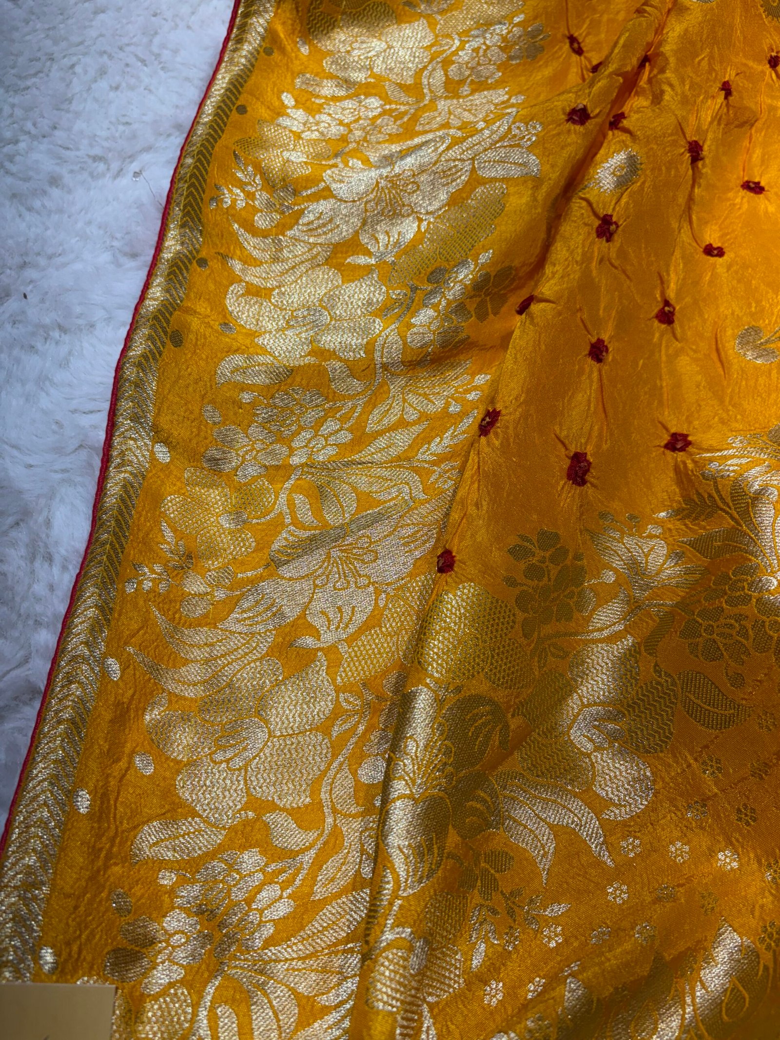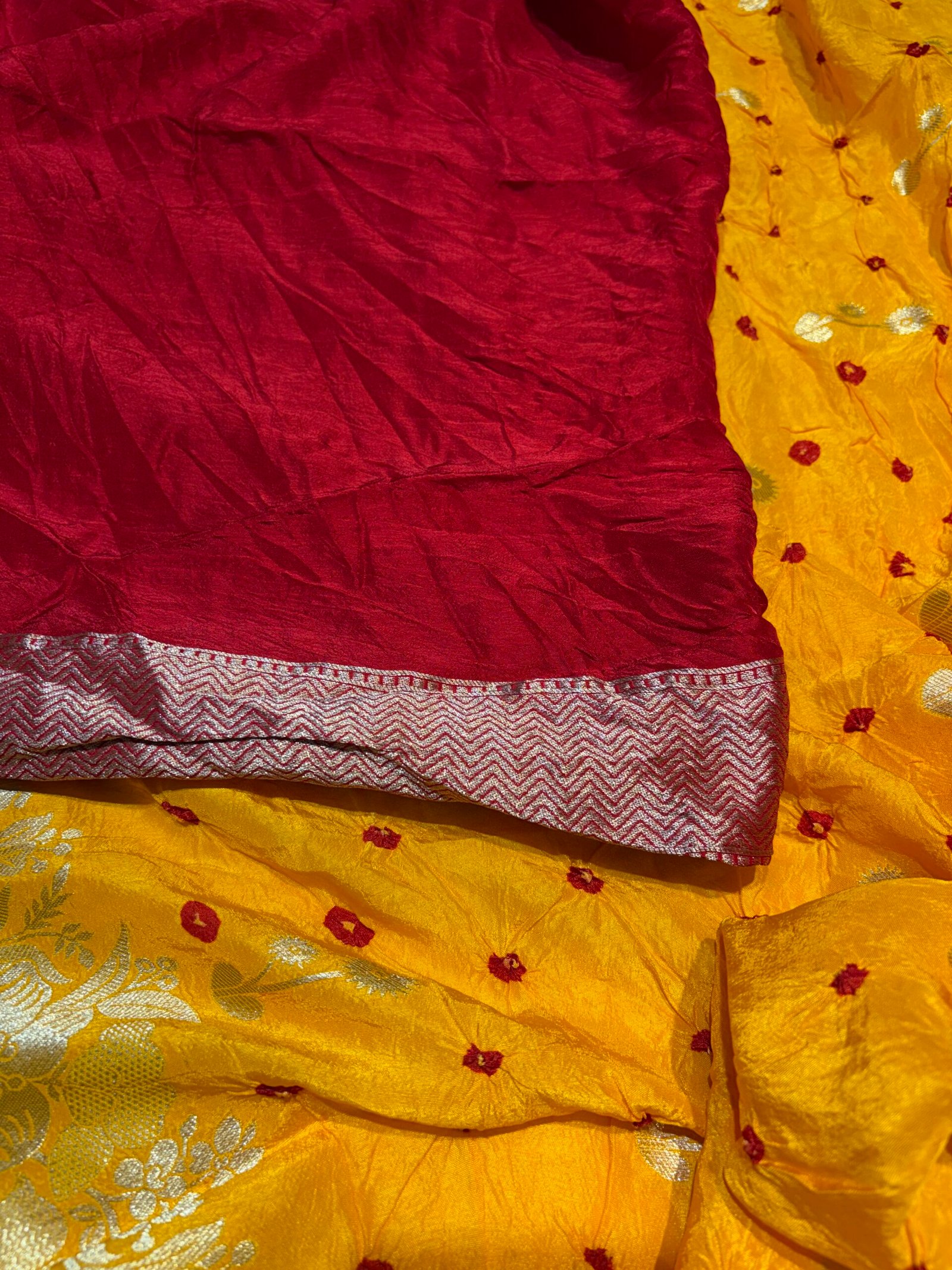 This saree features a stunning combination of traditional Banarasi weaving and authentic Handloom Bandhej tie-dye work.
