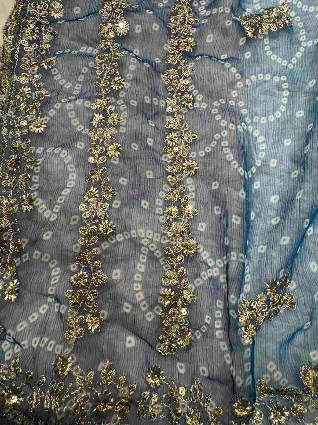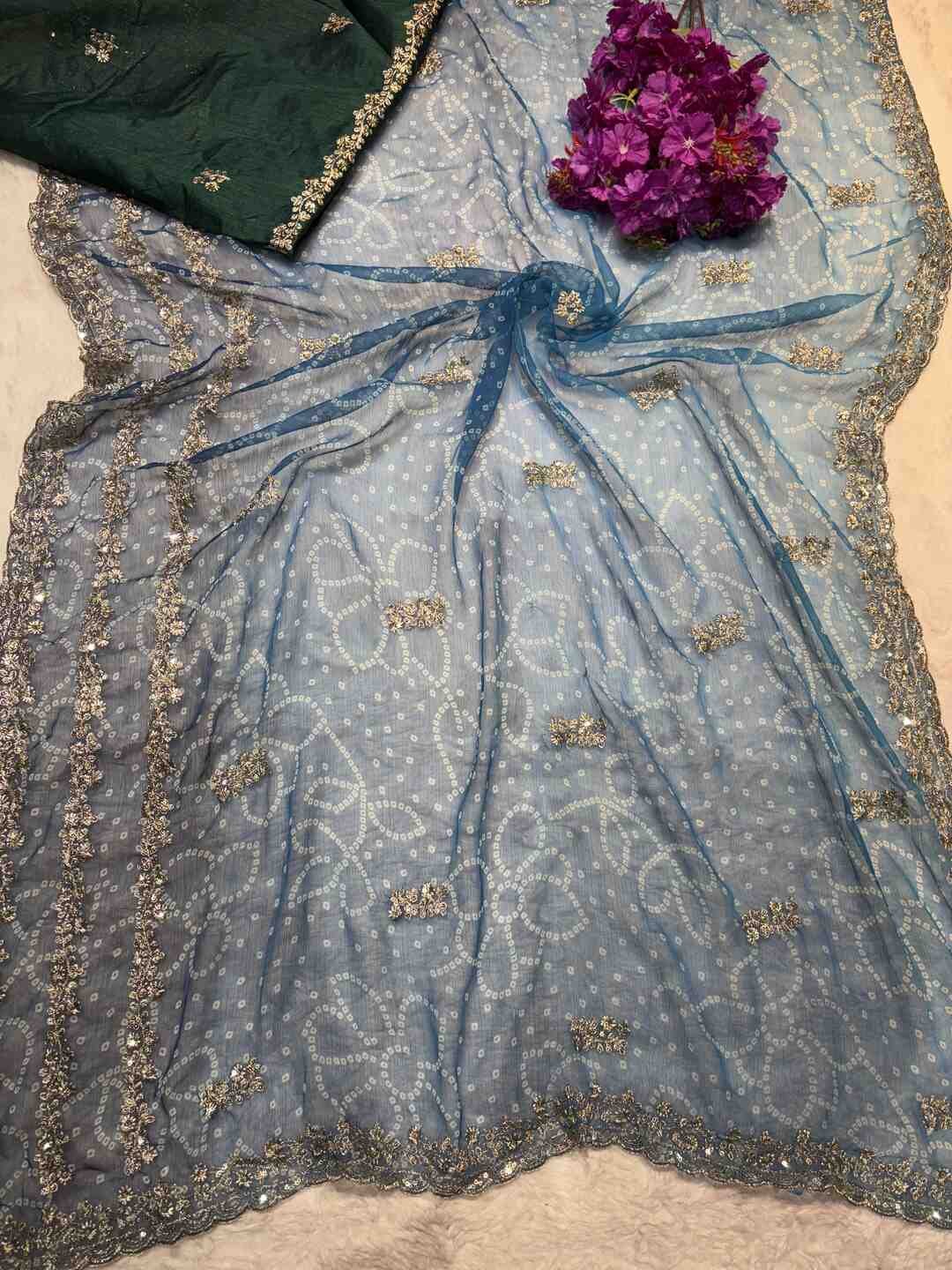 This saree features a unique combination of Traditional Bandhej + Three Line Work, creating a trendy and refined ethnic look.