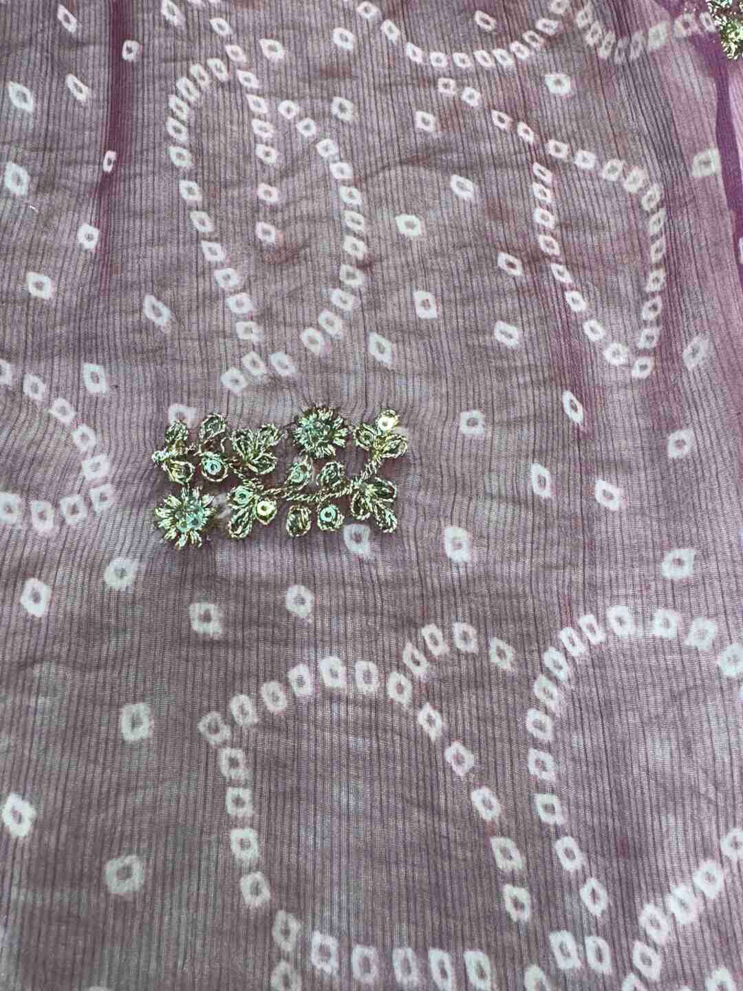 This saree features a unique combination of Traditional Bandhej + Three Line Work, creating a trendy and refined ethnic look.