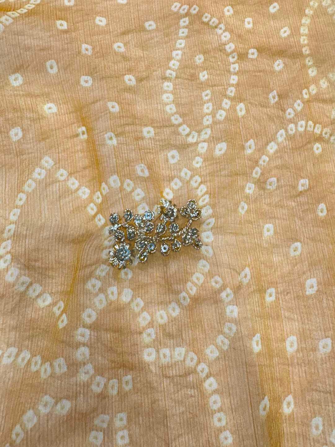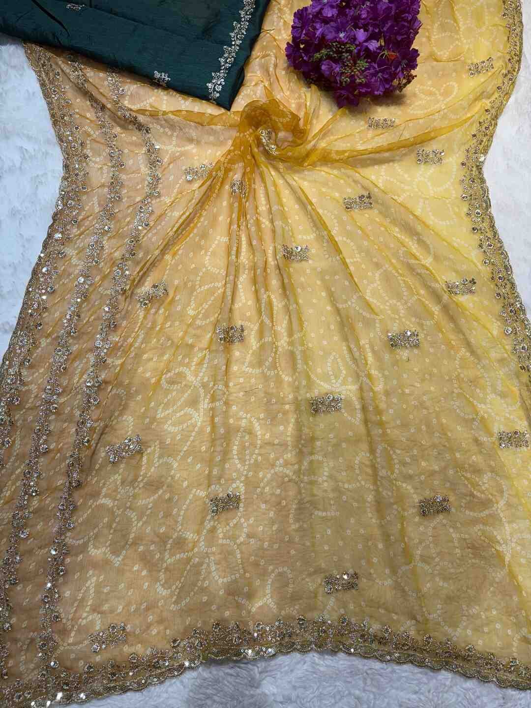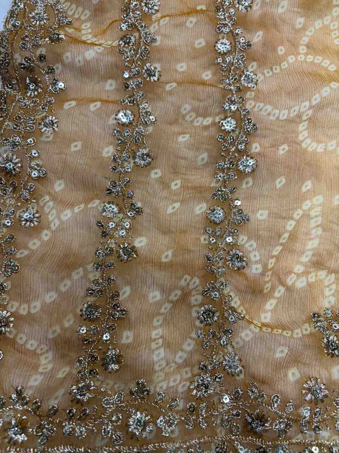 This saree features a unique combination of Traditional Bandhej + Three Line Work, creating a trendy and refined ethnic look.