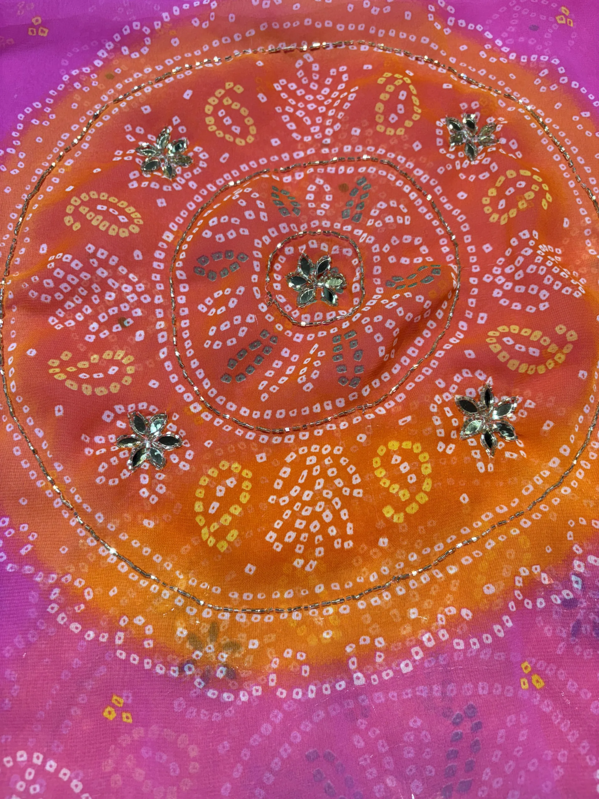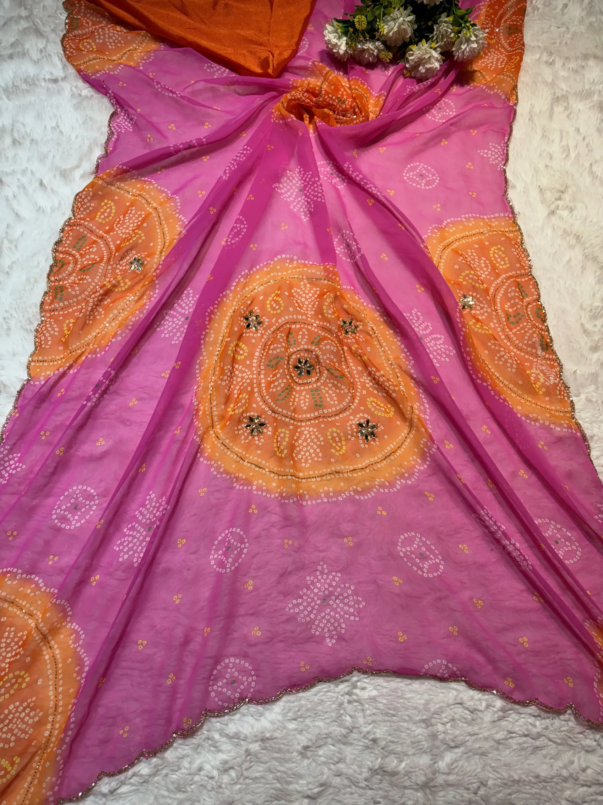 Crafted from a fabric chosen to beautifully hold the Bandhej tie-dye and support the delicate beading (such as Pure Georgette, Silk Blend, or Fine Crepe), this saree ensures a fluid, elegant, and comfortable drape. The material’s quality allows the dense patterns to shine while providing a stable frame for the meticulous Handcut Dana work.