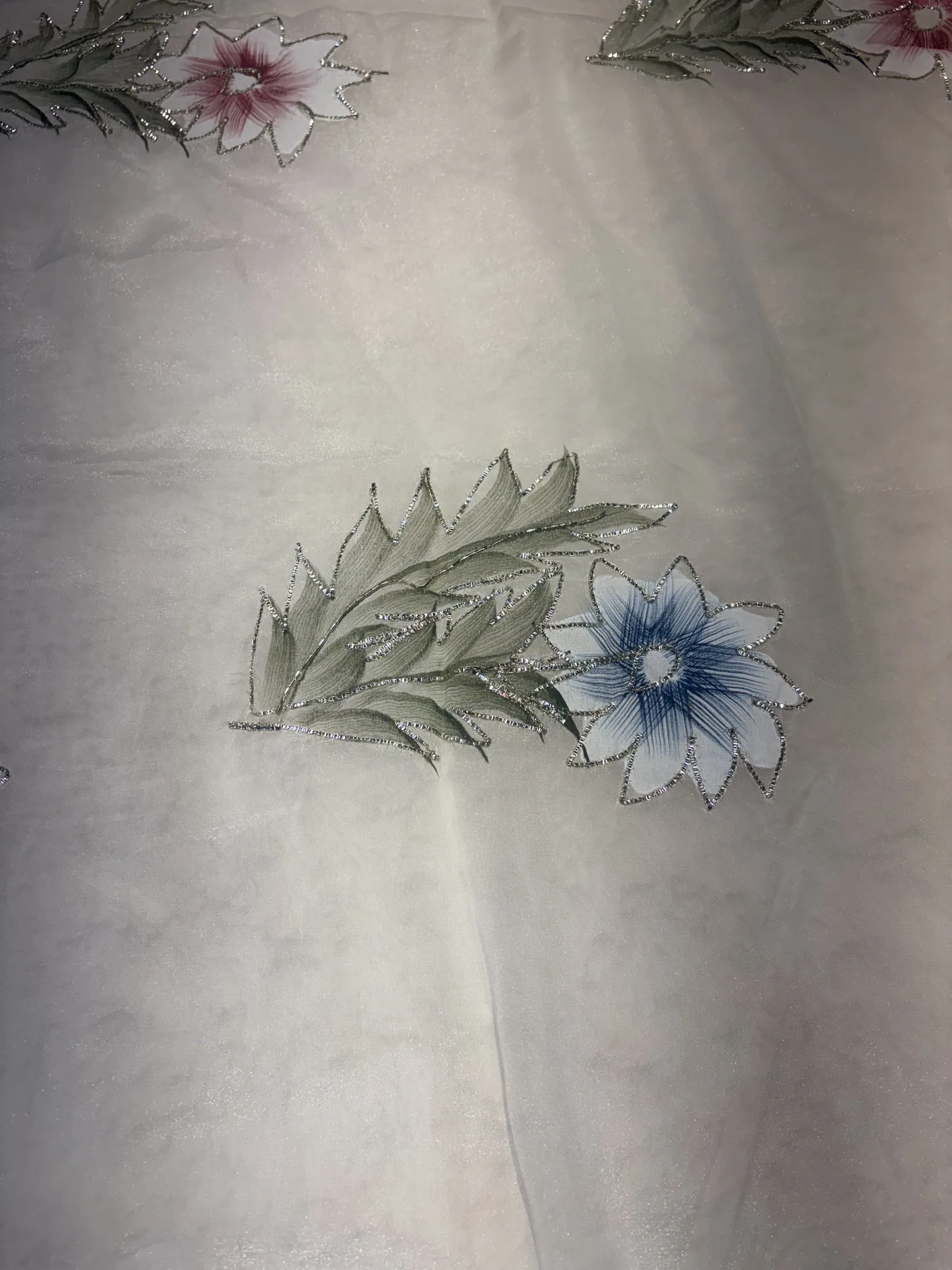 Hand-stitched Kacha Gotta motifs placed beautifully across the saree