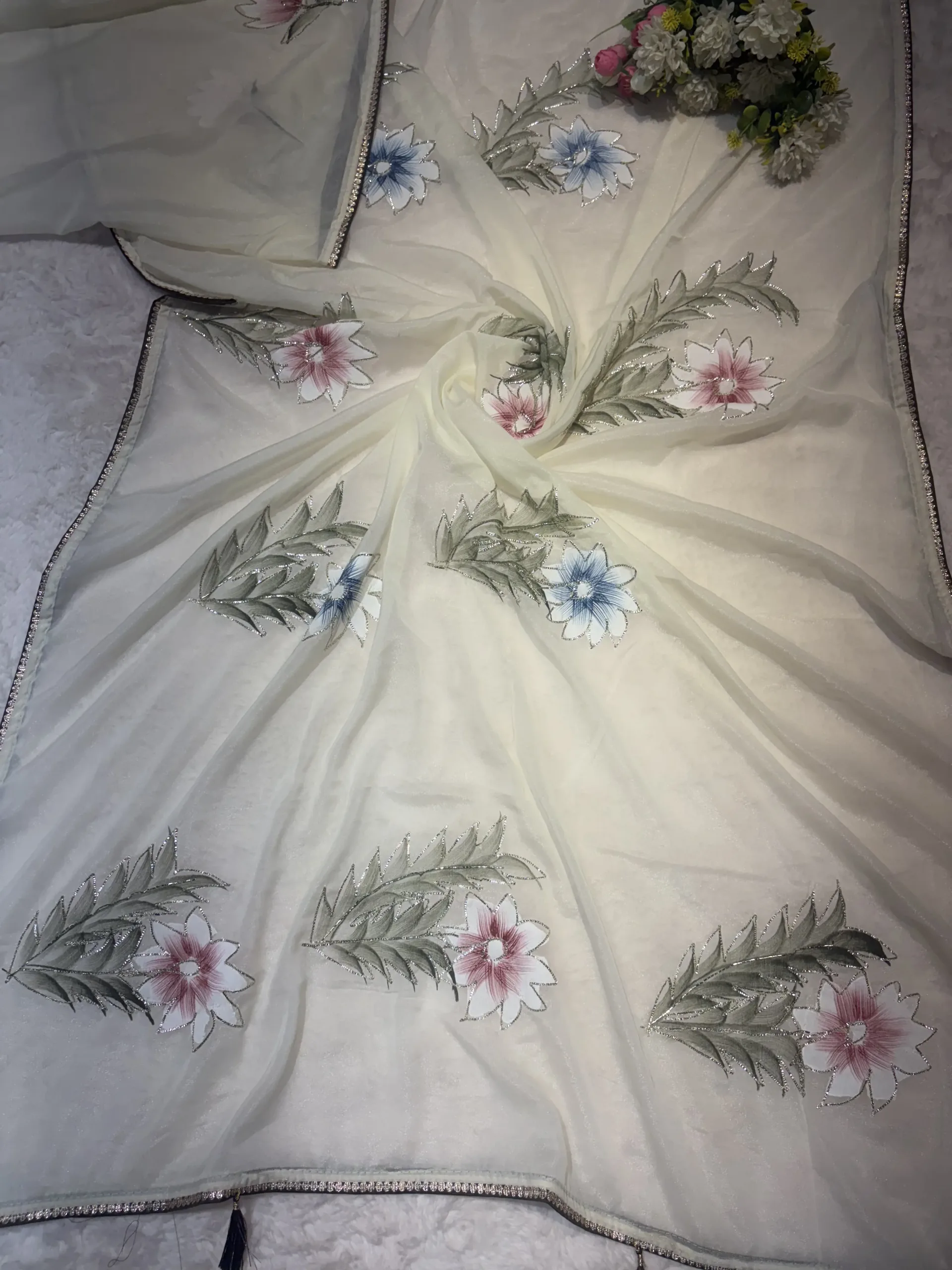 A stunning fusion of artistry: The trending cream saree is beautifully highlighted with intricate Kacha Gotta work, creating a rich, festive drape that feels traditional, graceful, and effortlessly luxurious.