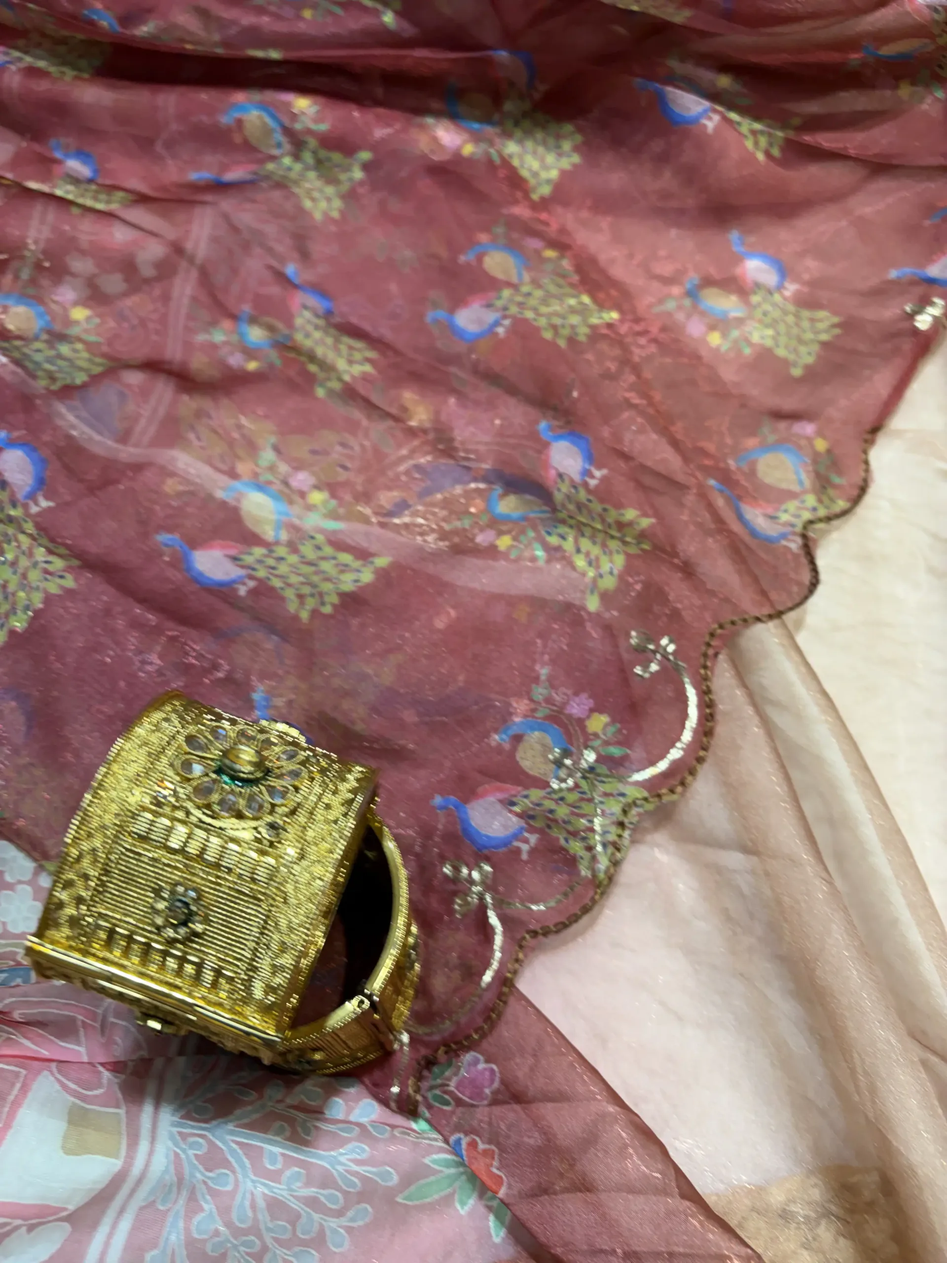 The unstitched blouse option allows flexibility while maintaining a traditional royal aesthetic.