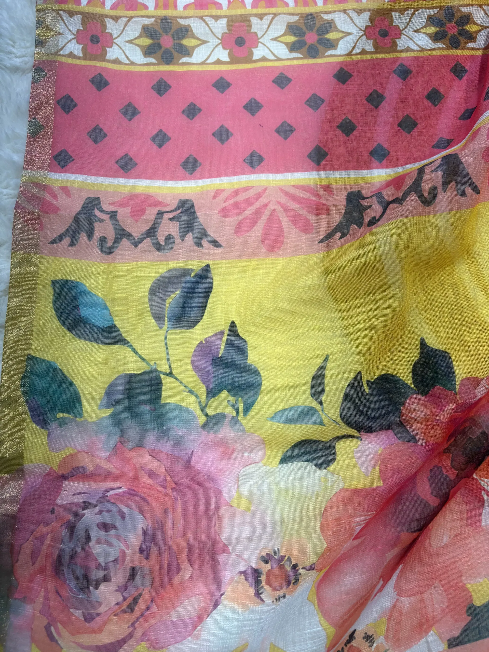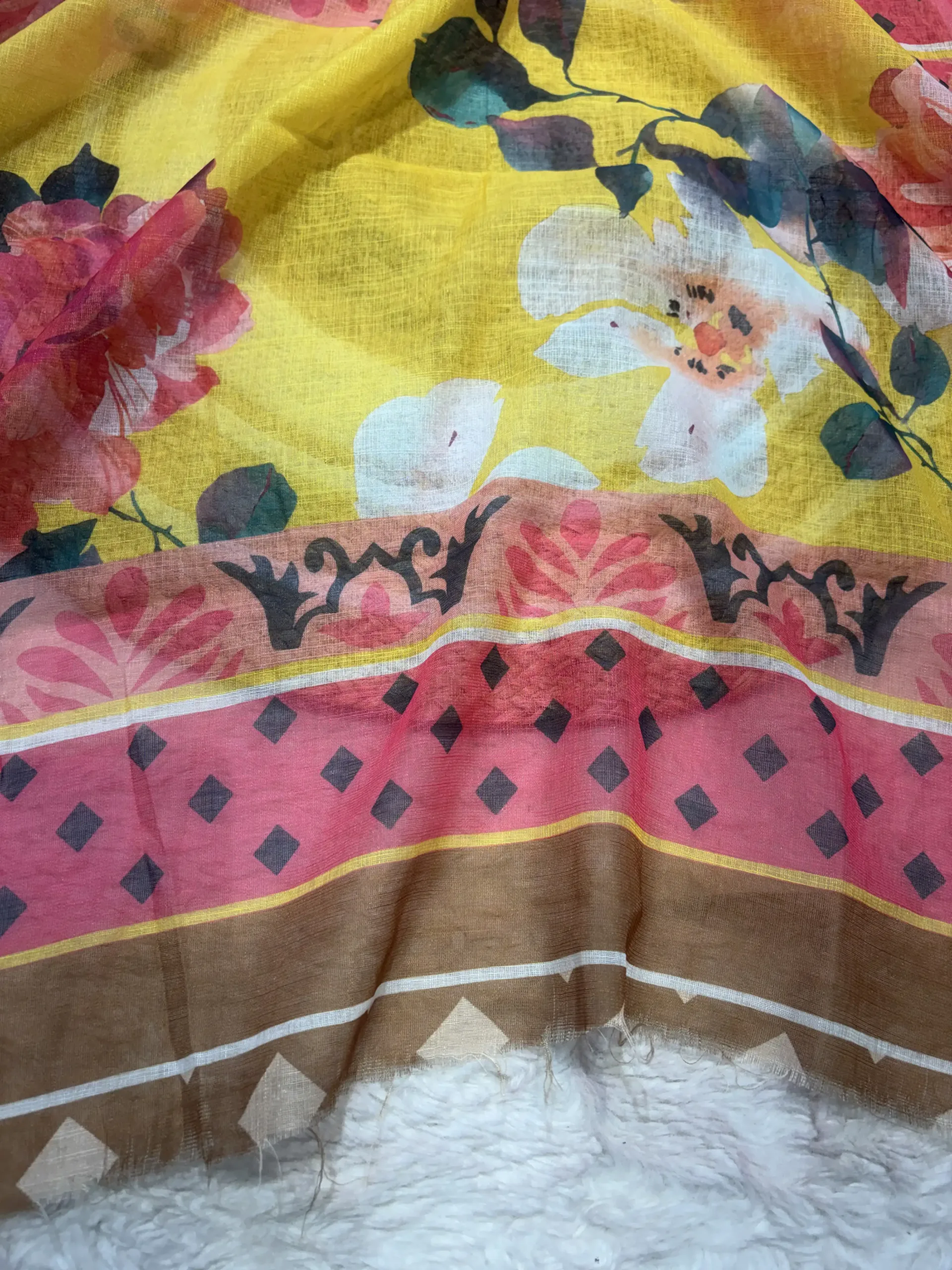 This saree features a vibrant Flower Digital Print, offering a fresh and elegant everyday look.