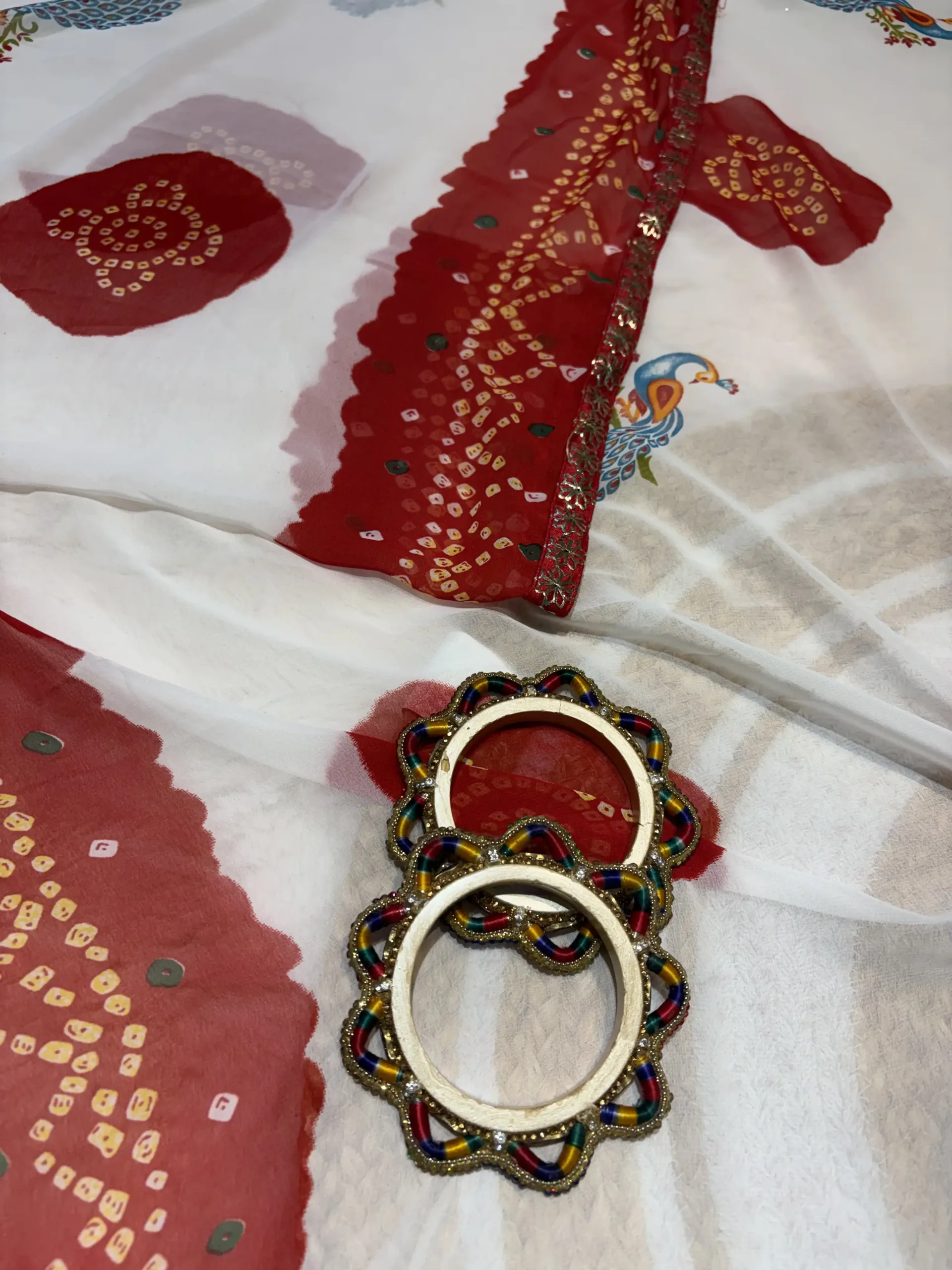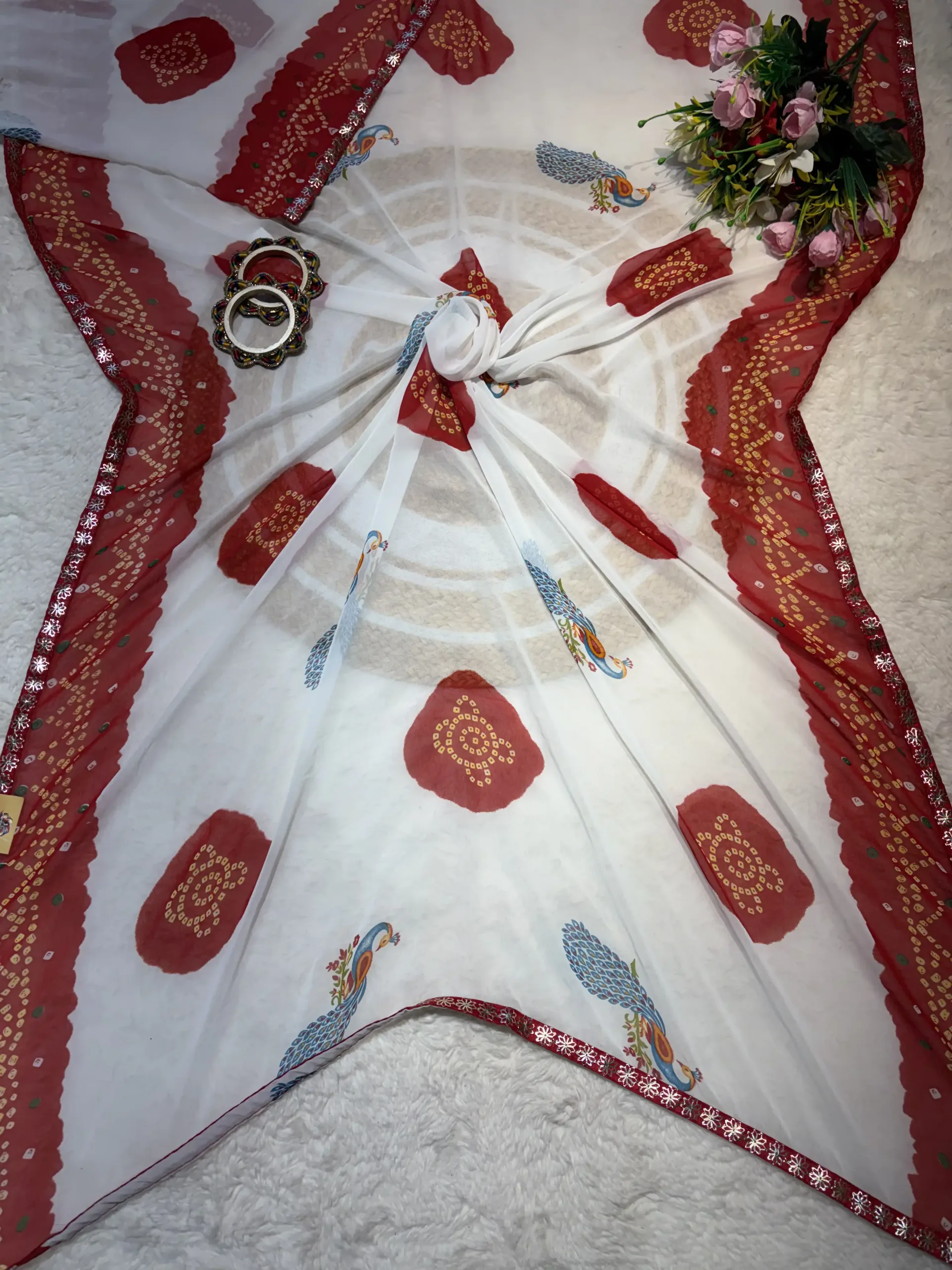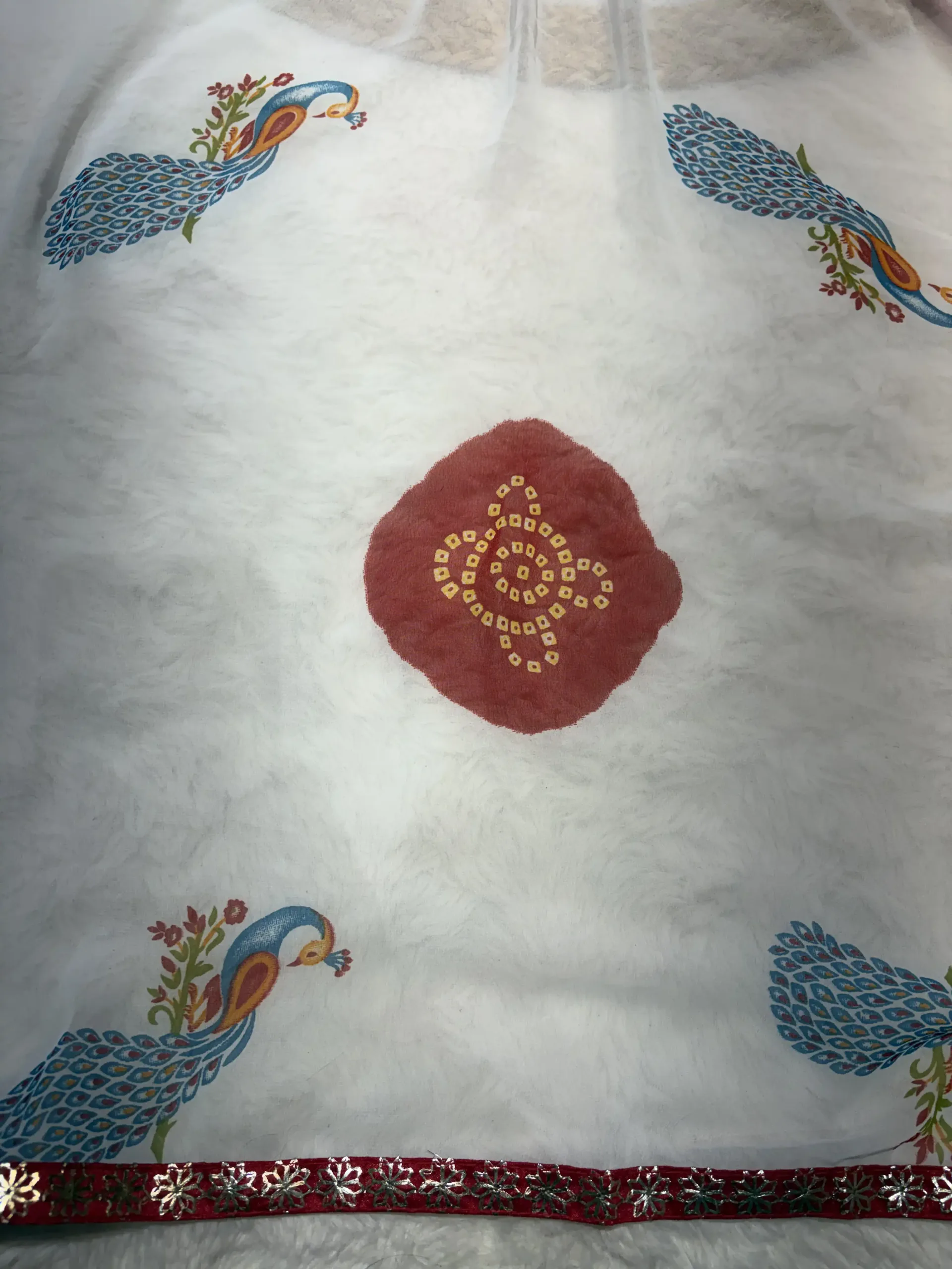 The fabric beautifully supports the richness of white–red tones and highlights the peacock print elegantly.