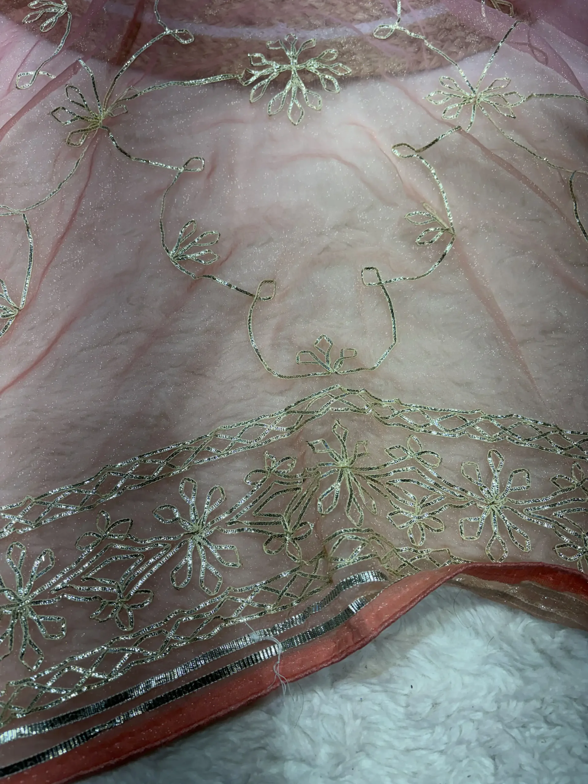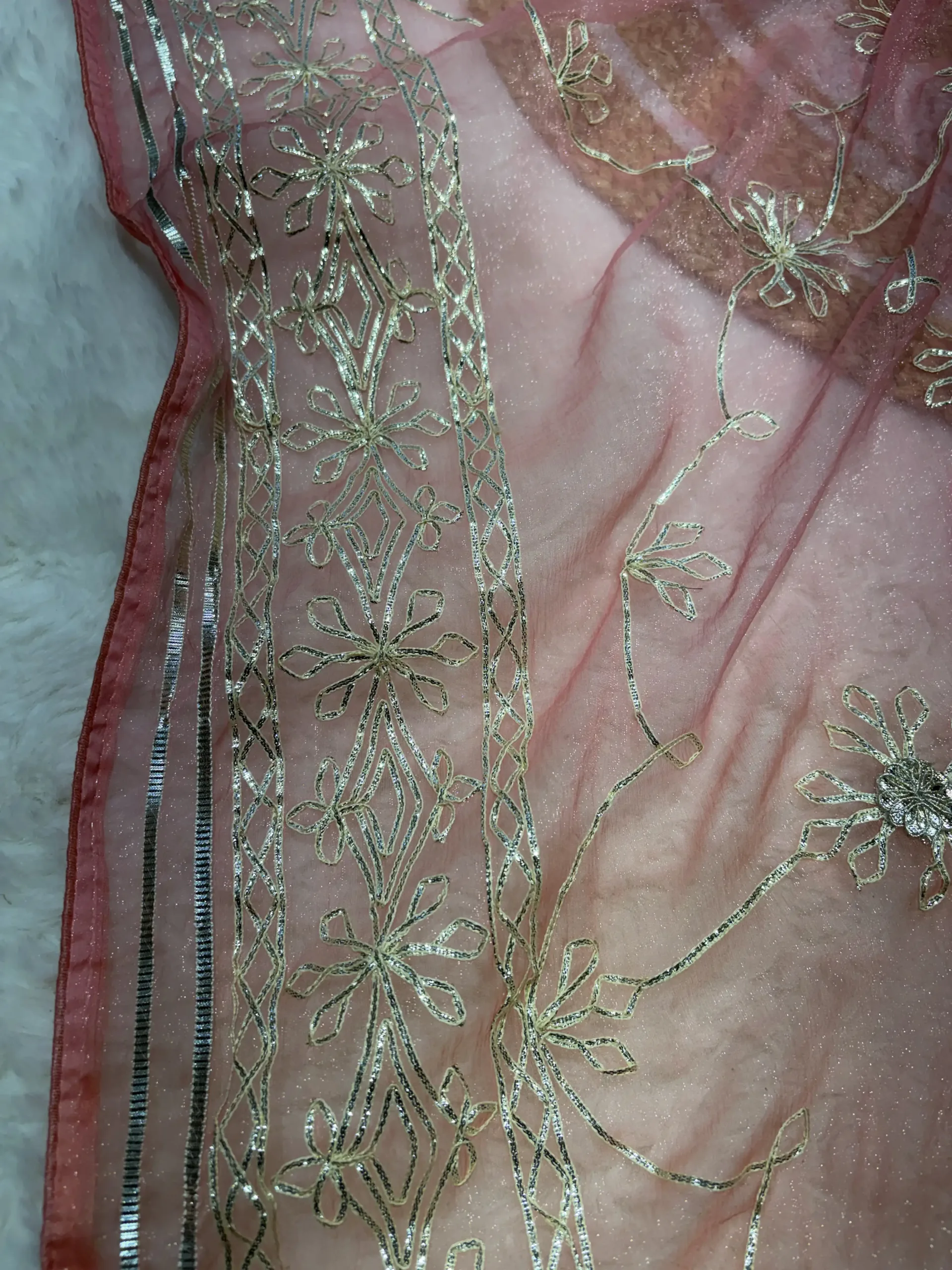 Shimmer chiffon perfectly enhances the handcrafted gota work without adding heaviness.