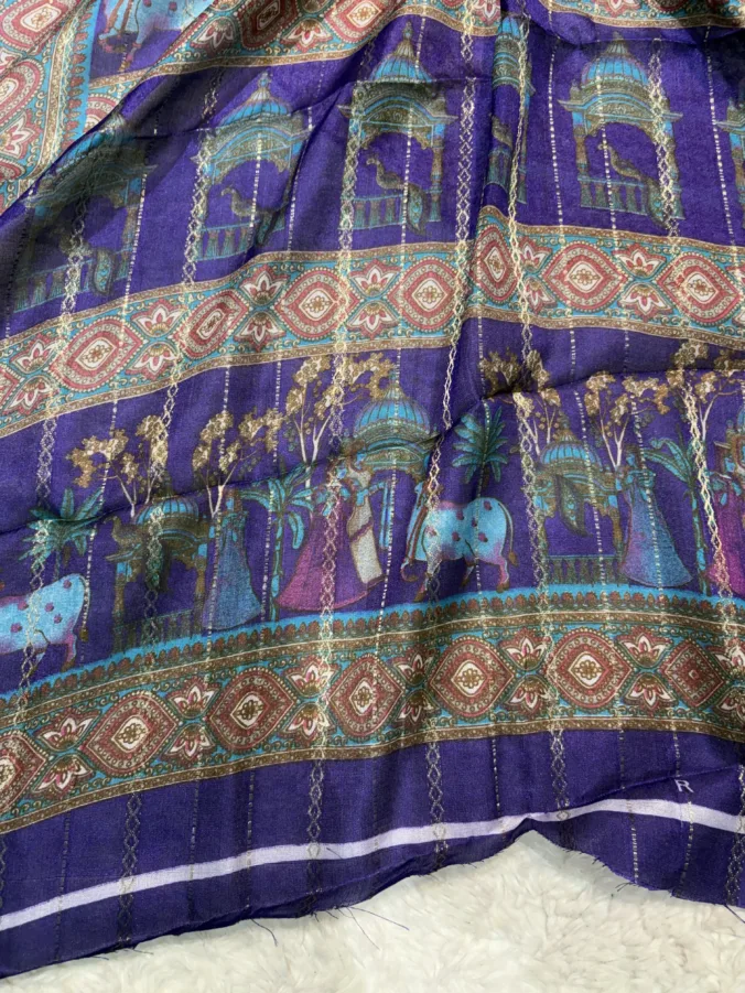 This saree features a vibrant Flower Digital Print, offering a fresh and elegant everyday look.