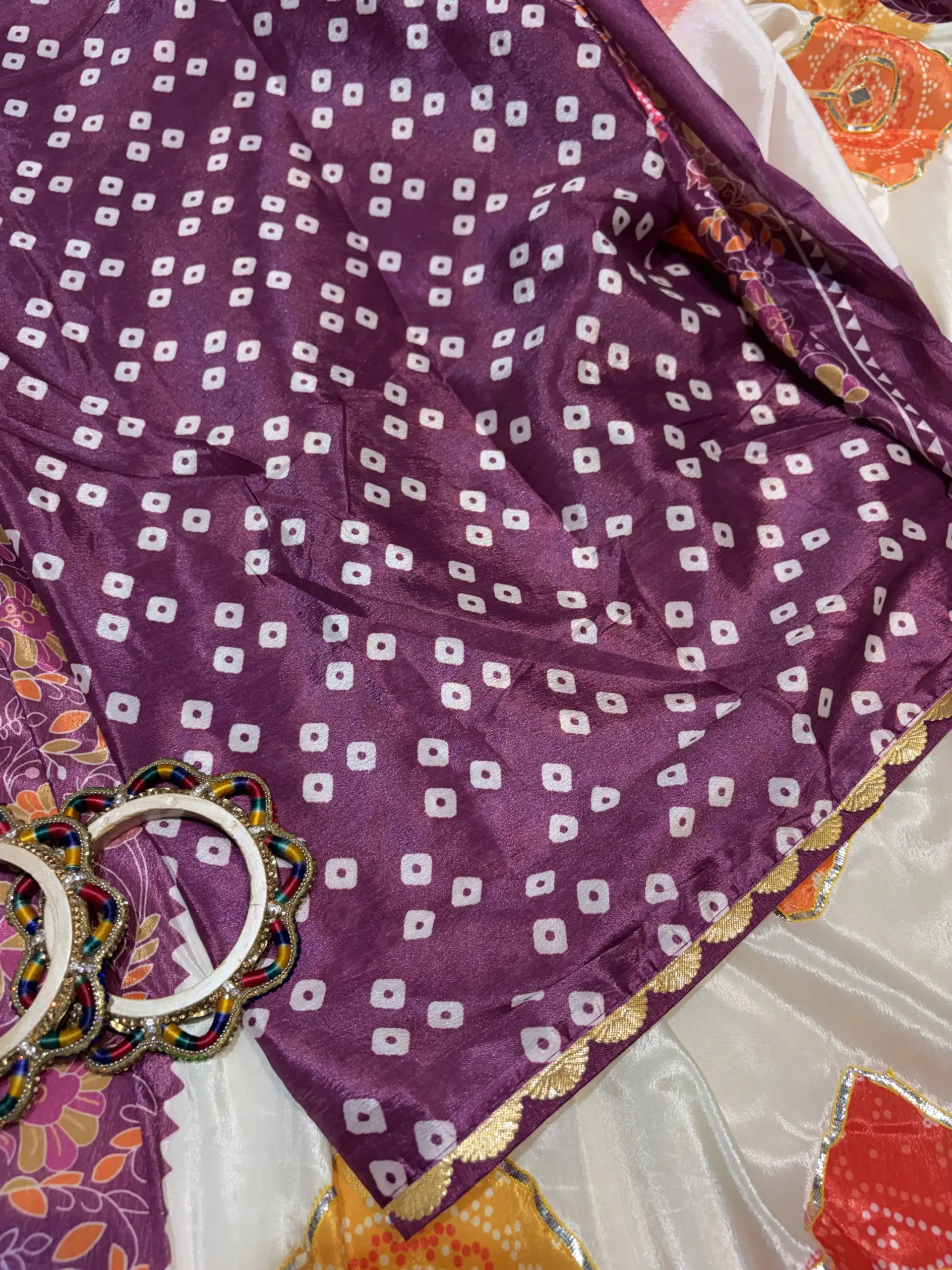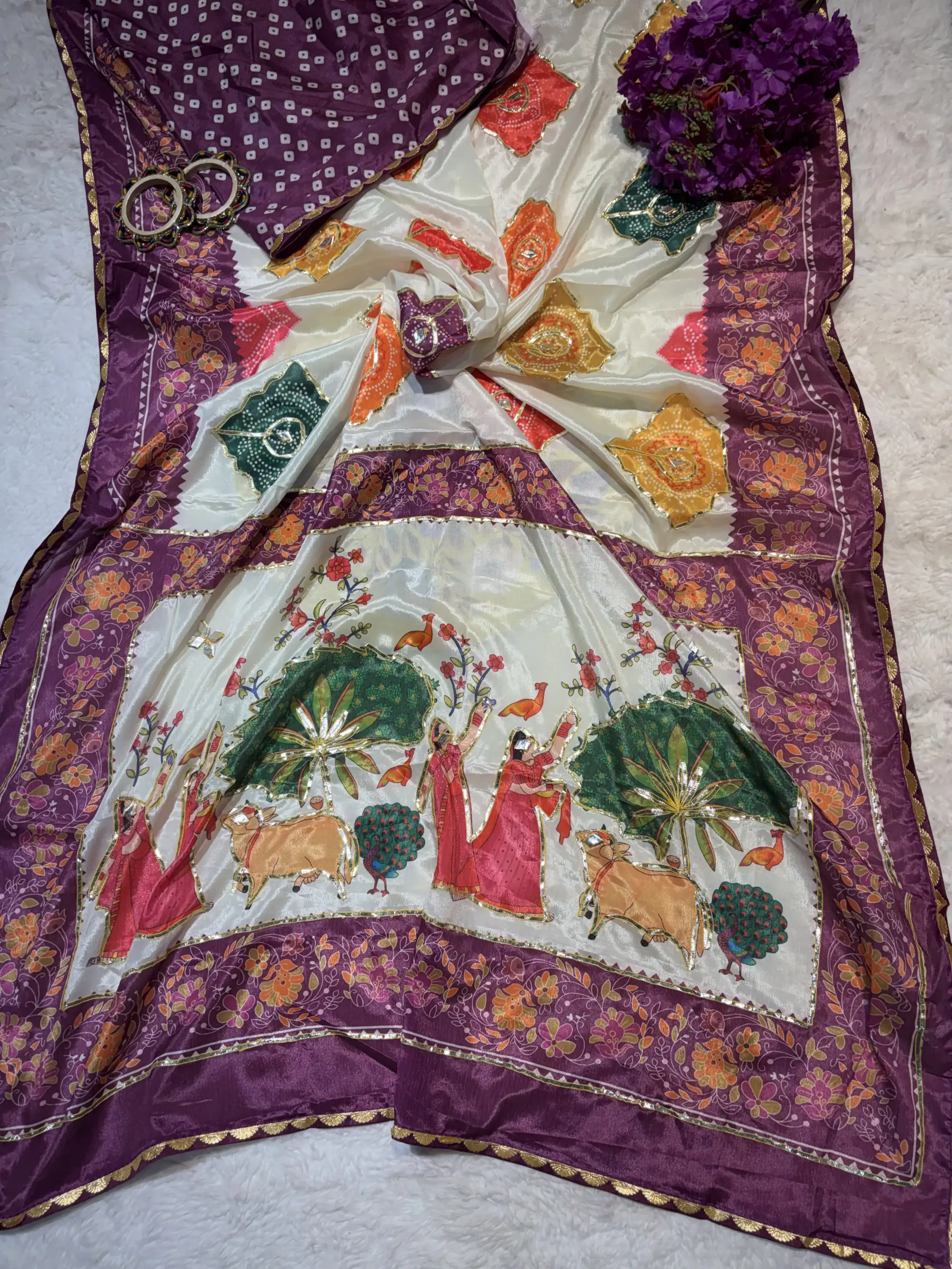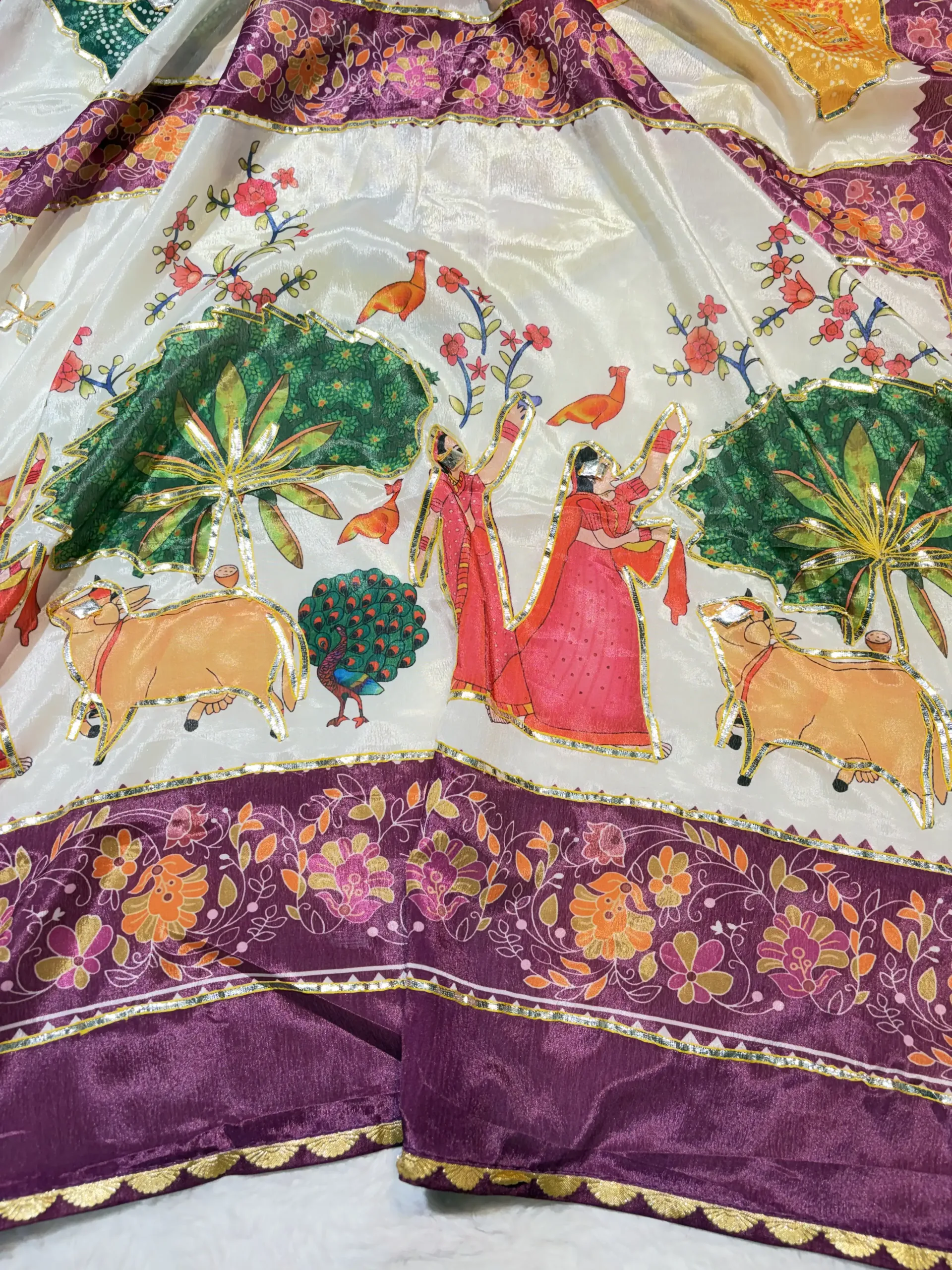 The fabric beautifully highlights the printed artwork while supporting the traditional gota detailing.