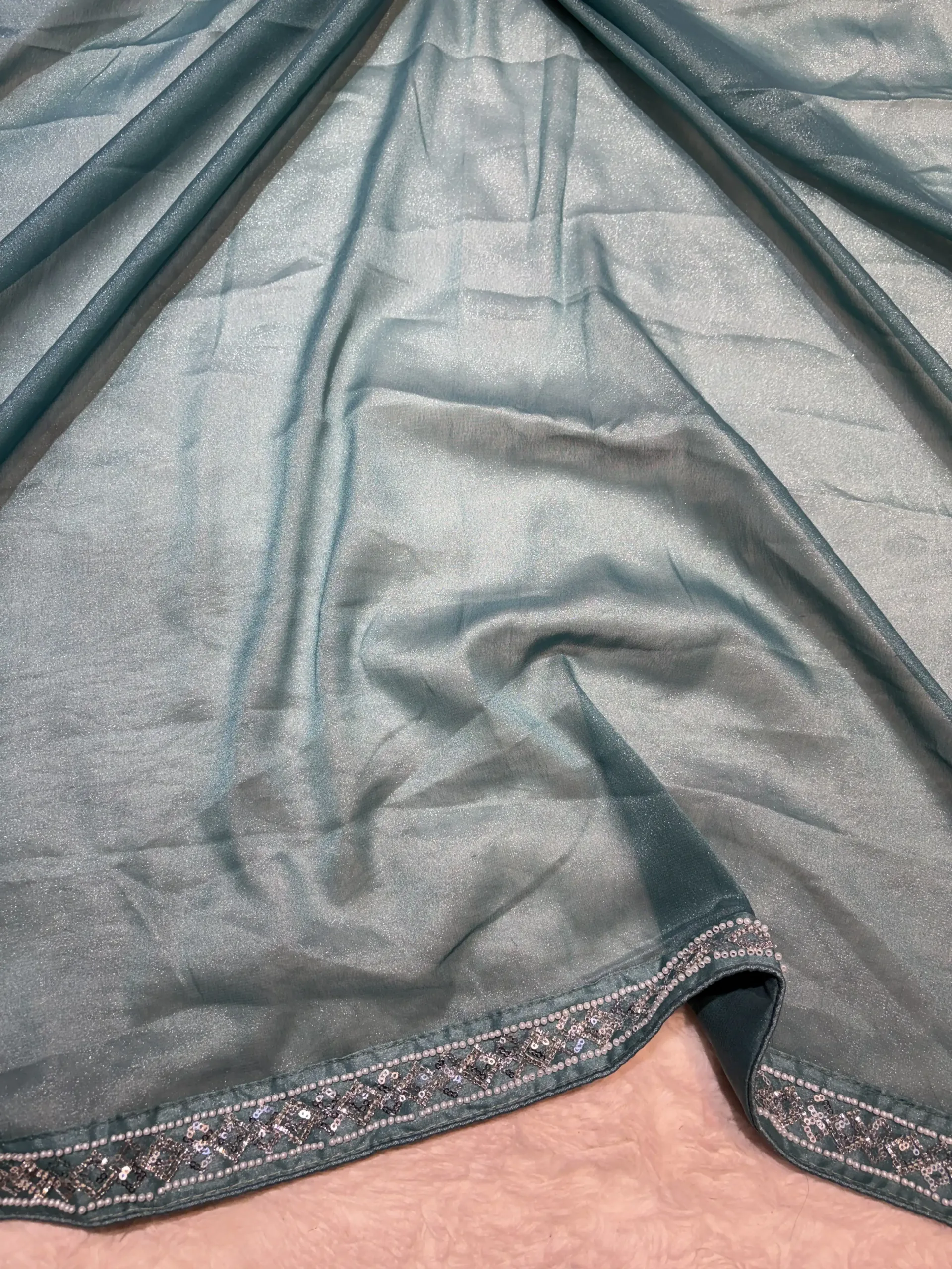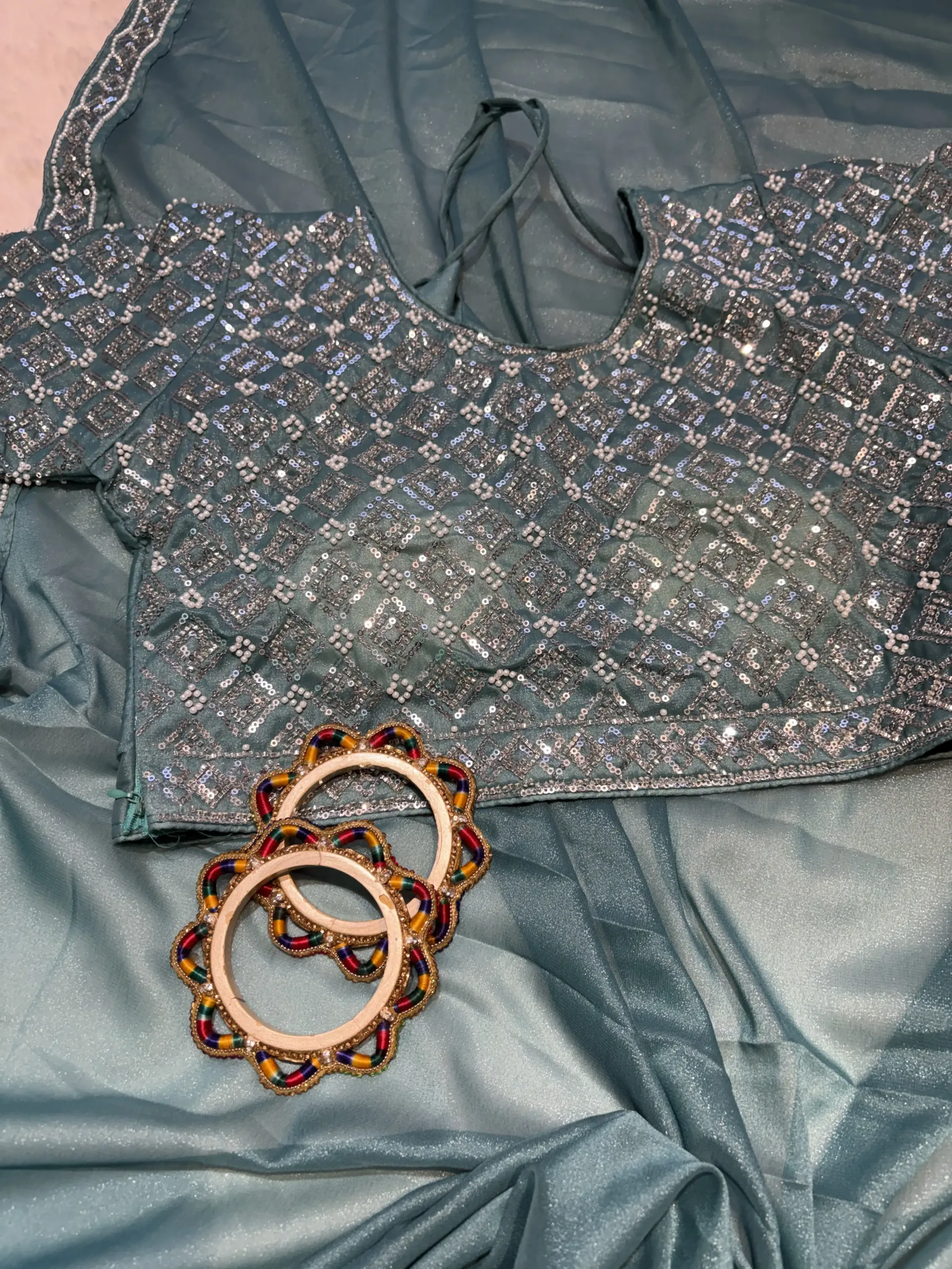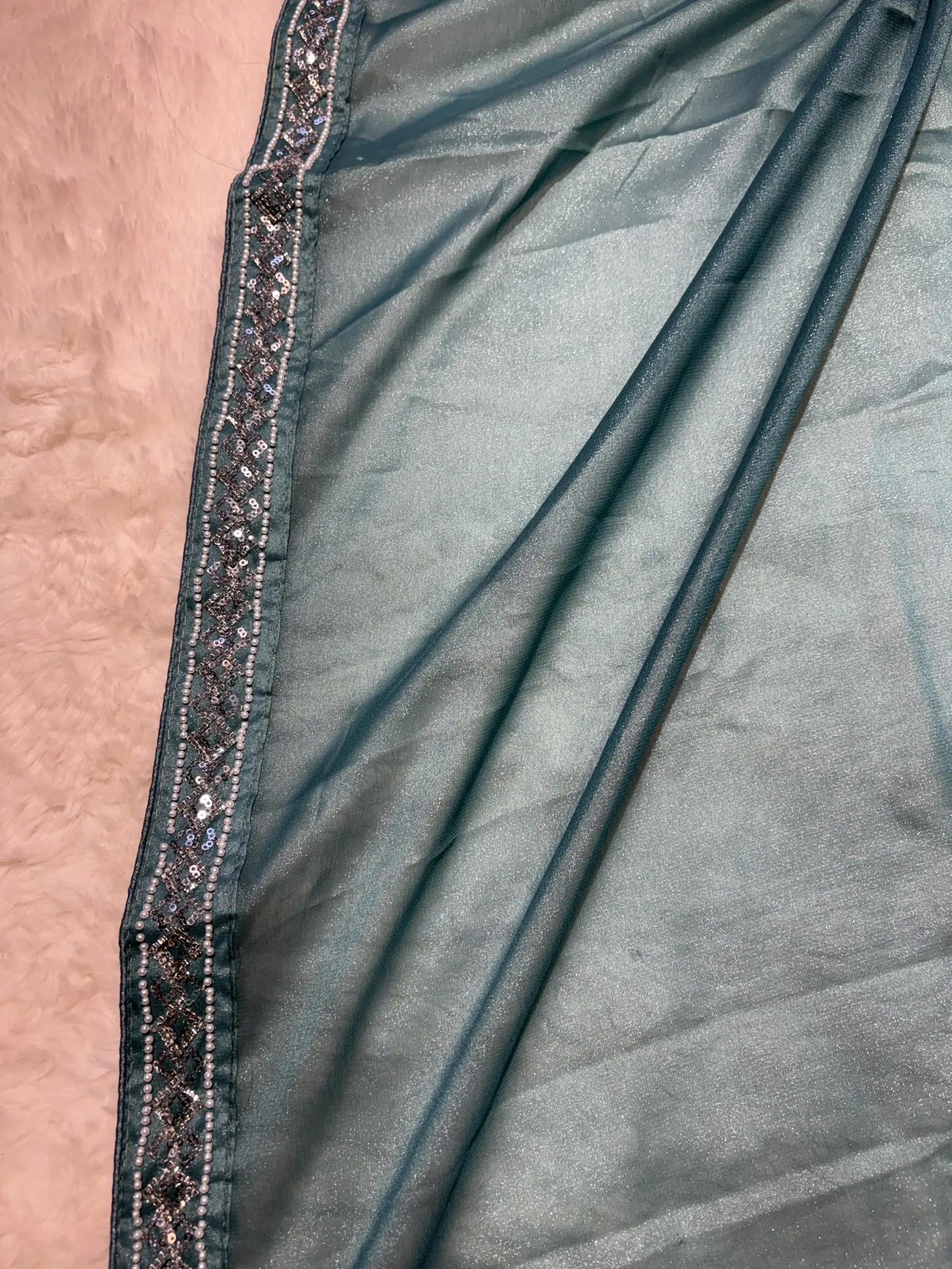 Be the first to review “NEELAM TRADERS NEW LAUNCH TRENDING Party wear Stitched blouse saree with hand moti work in soft Georgette fabric FIROZI”