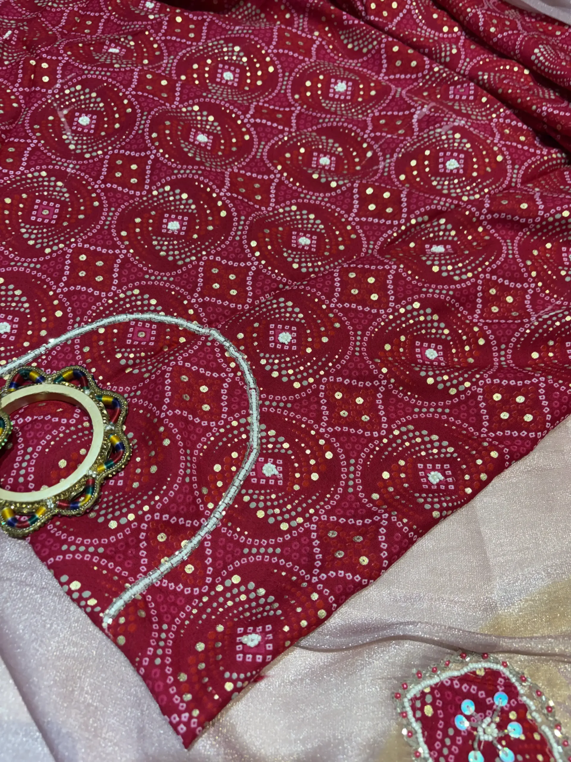 This saree features stylish Bandhej Patch Work, combined with a coordinated Bandhej Blouse for a complete festive ensemble.