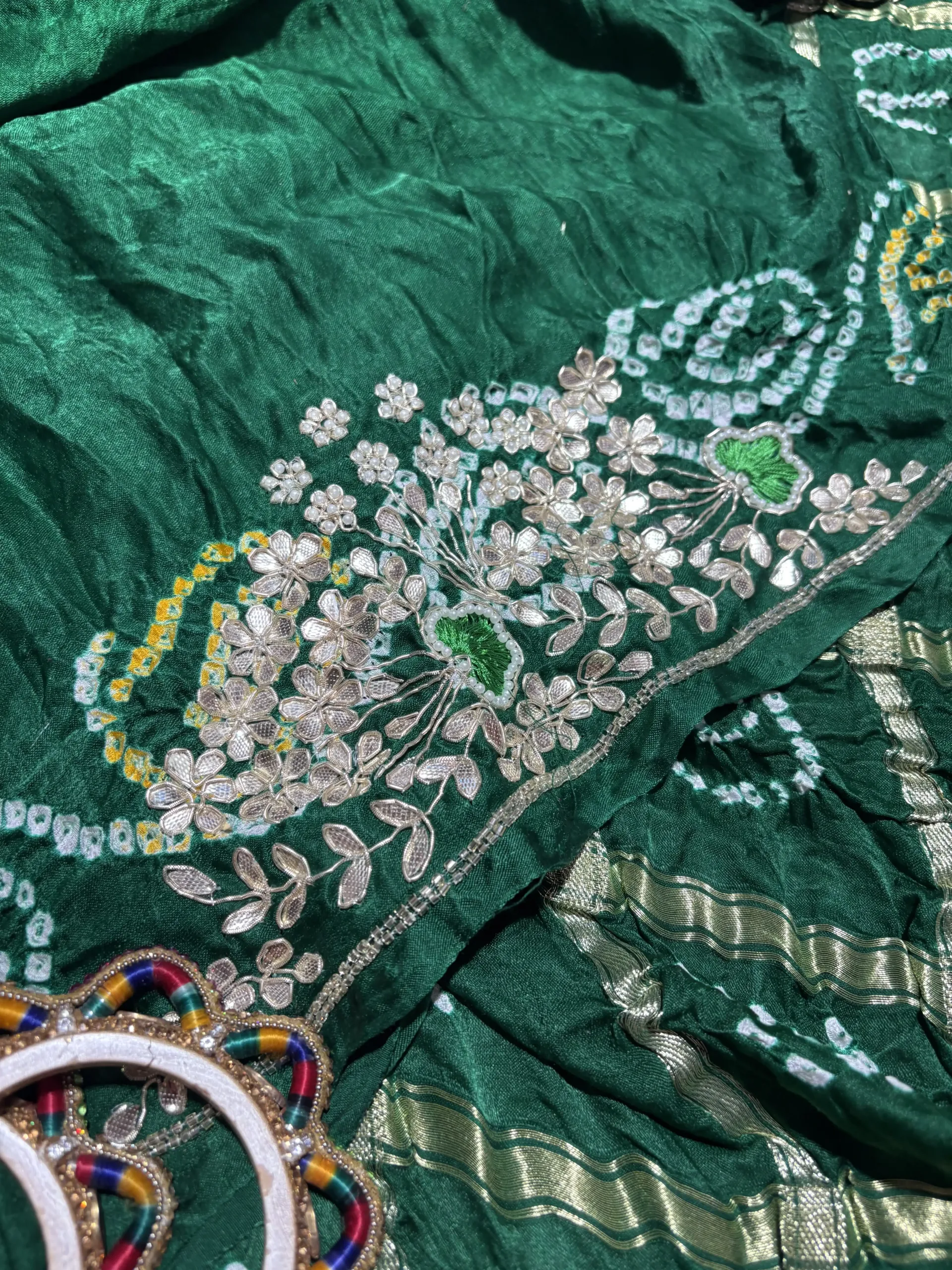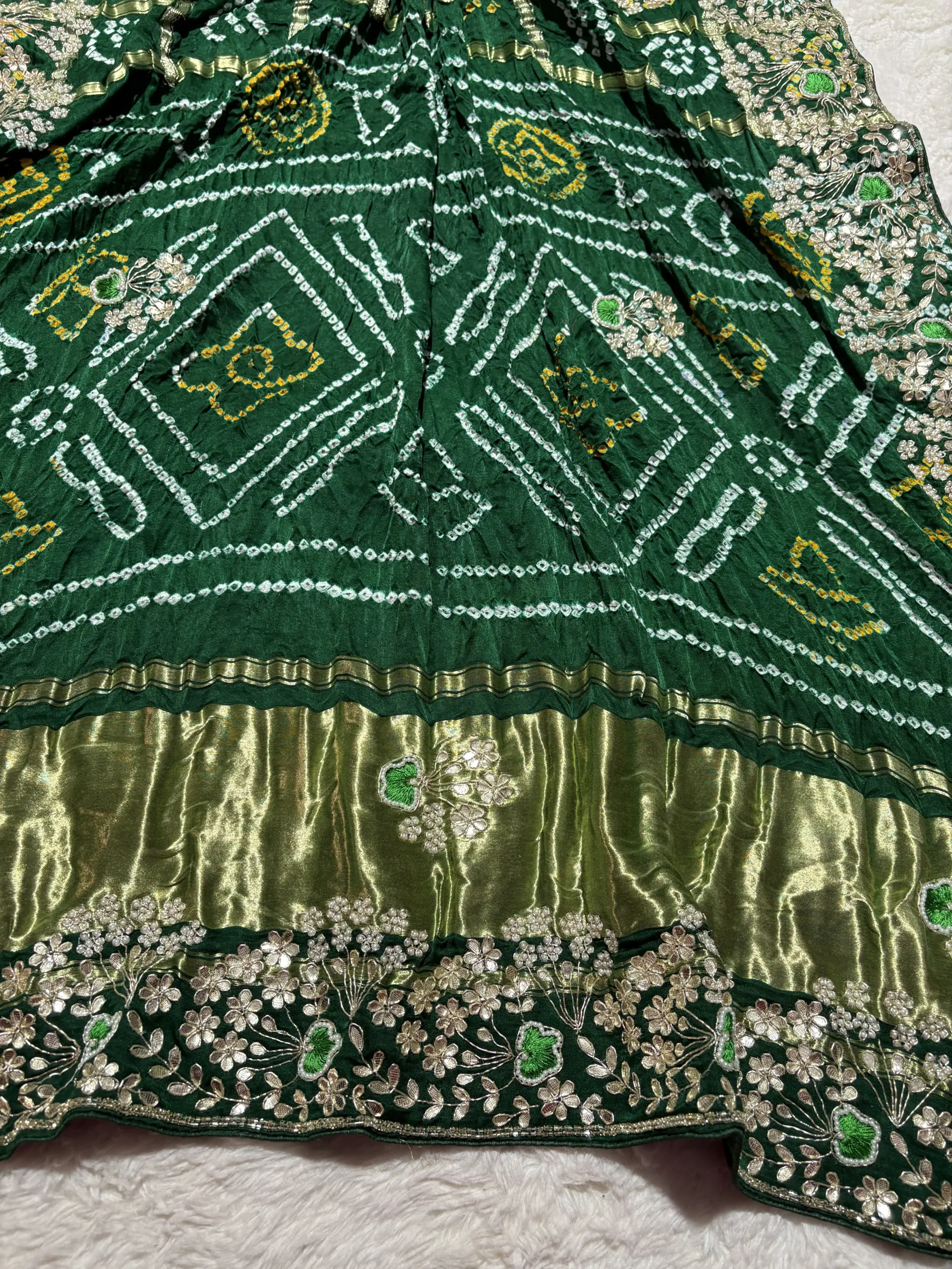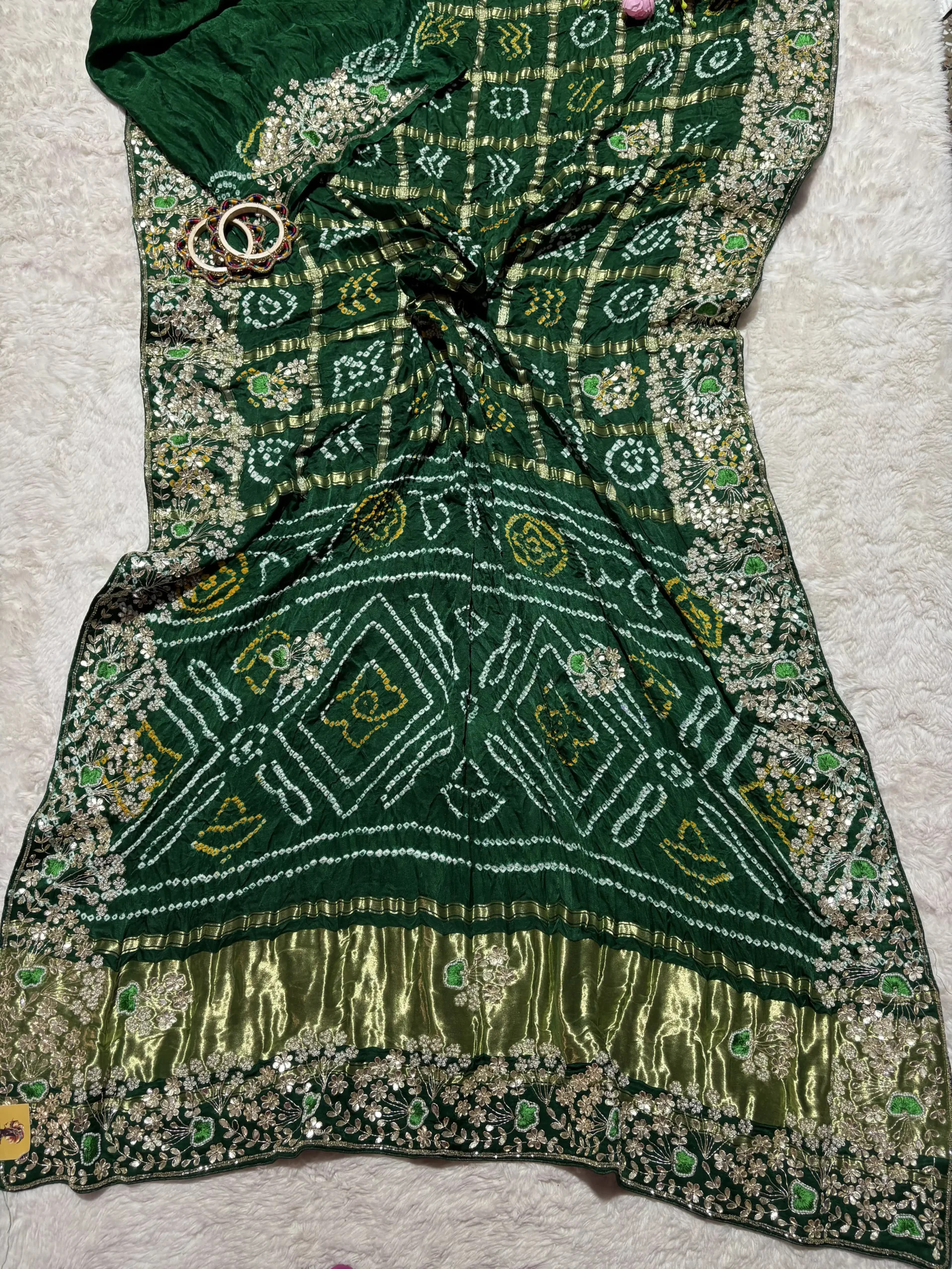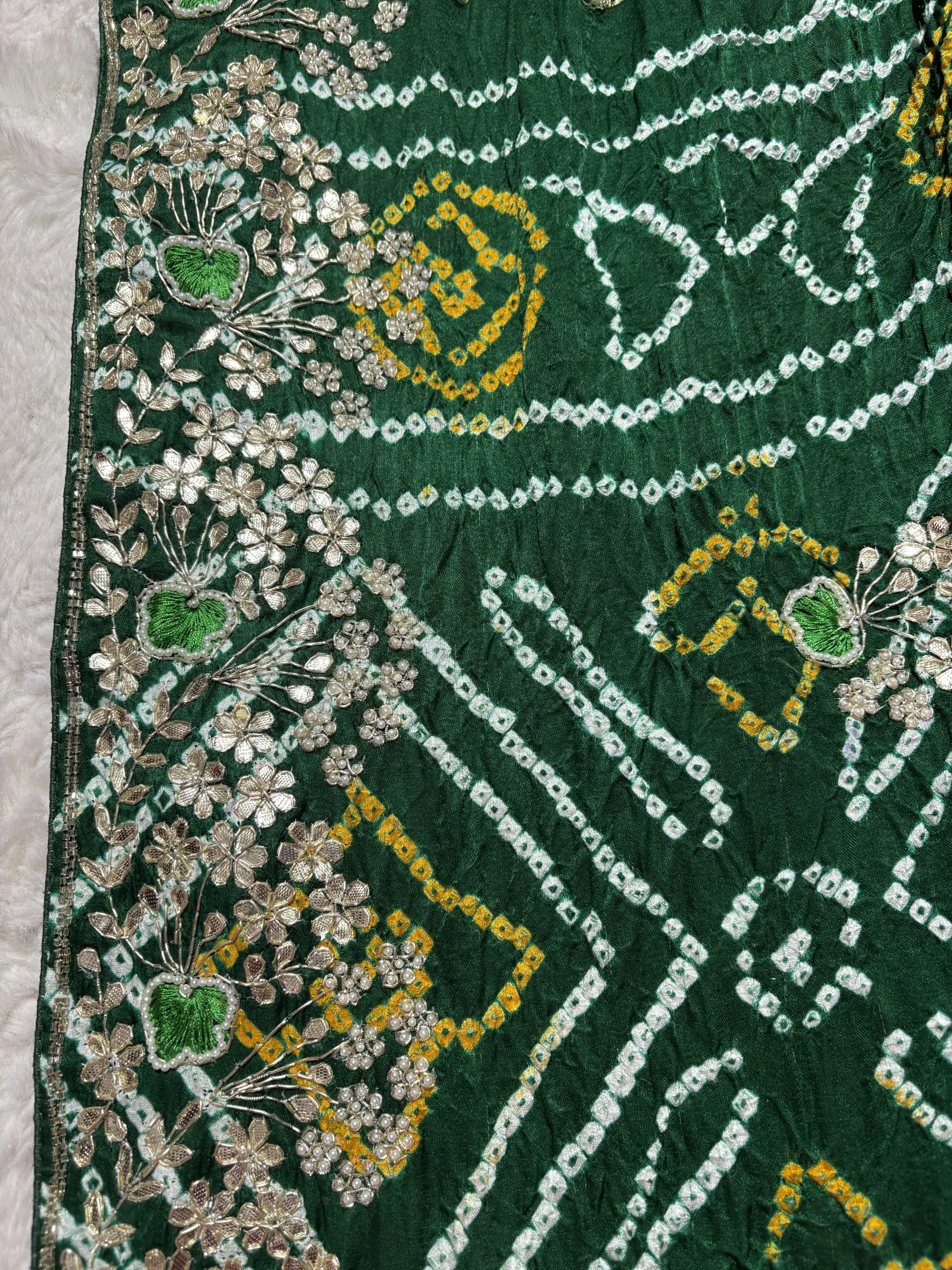 Gajji silk enhances the traditional Ghatchola pattern while maintaining a graceful and rich drape.