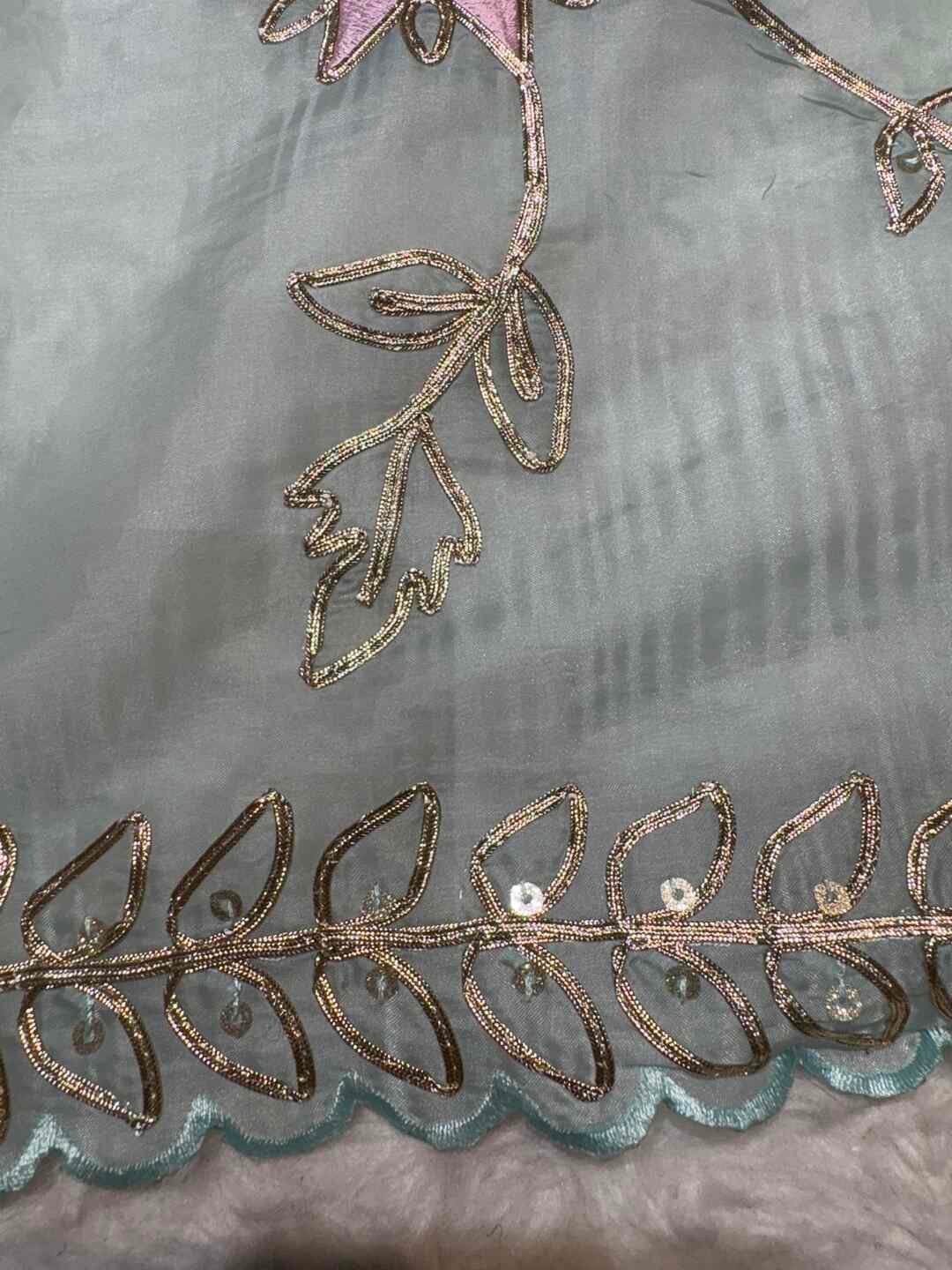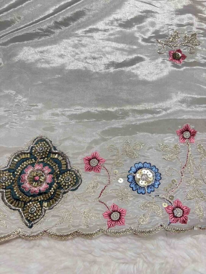 A stunning fusion of artistry: Trending Zaal work beautifully elevates the richness of H.O Silk fabric, creating a luxurious, graceful drape that feels festive, elegant, and effortlessly sophisticated.