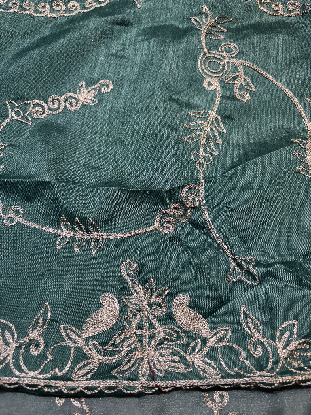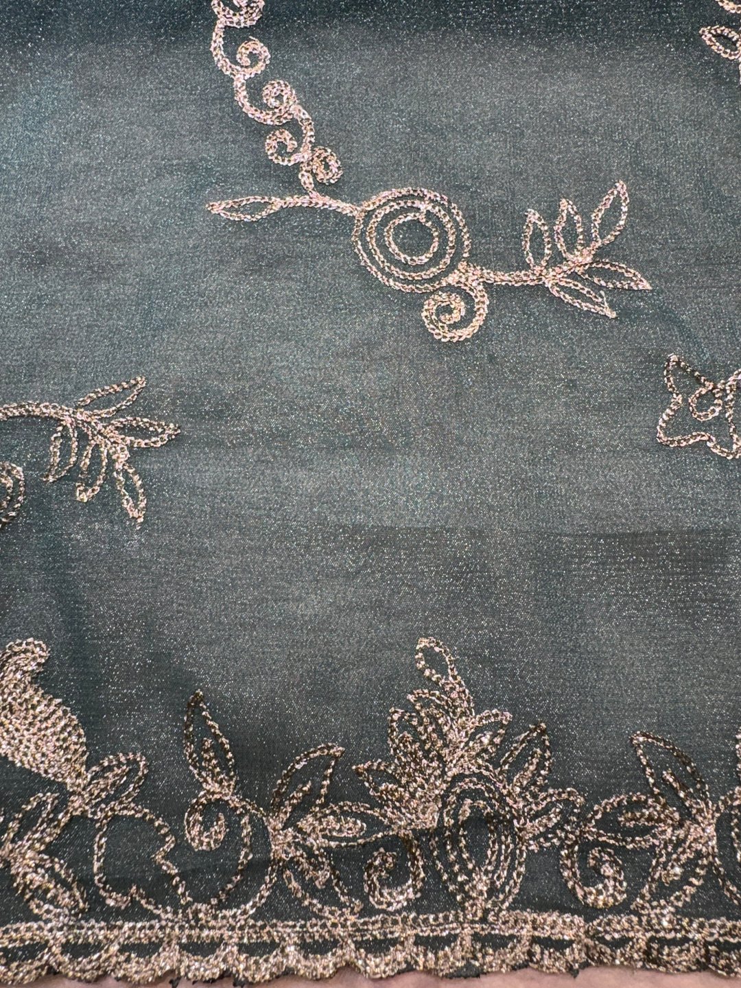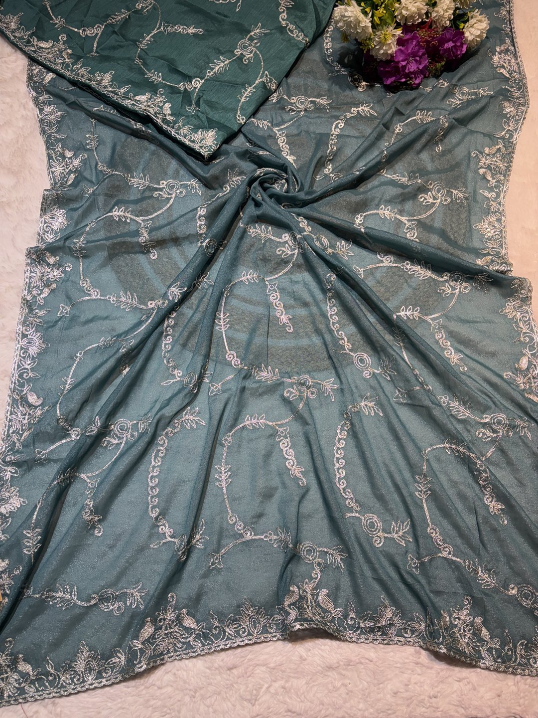 A stunning fusion of artistry: Intricate trending Zaal work enhances the soft, flowy fabric, creating a richly detailed drape that feels elegant, festive, and effortlessly luxurious.