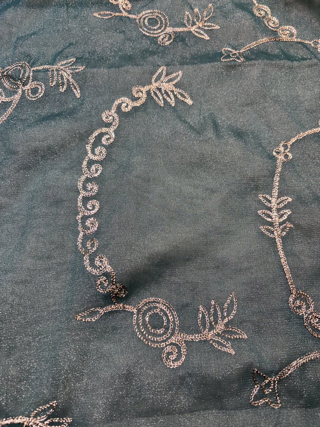 Floral vines, leaf patterns, or geometric net-style weaving/embroidery