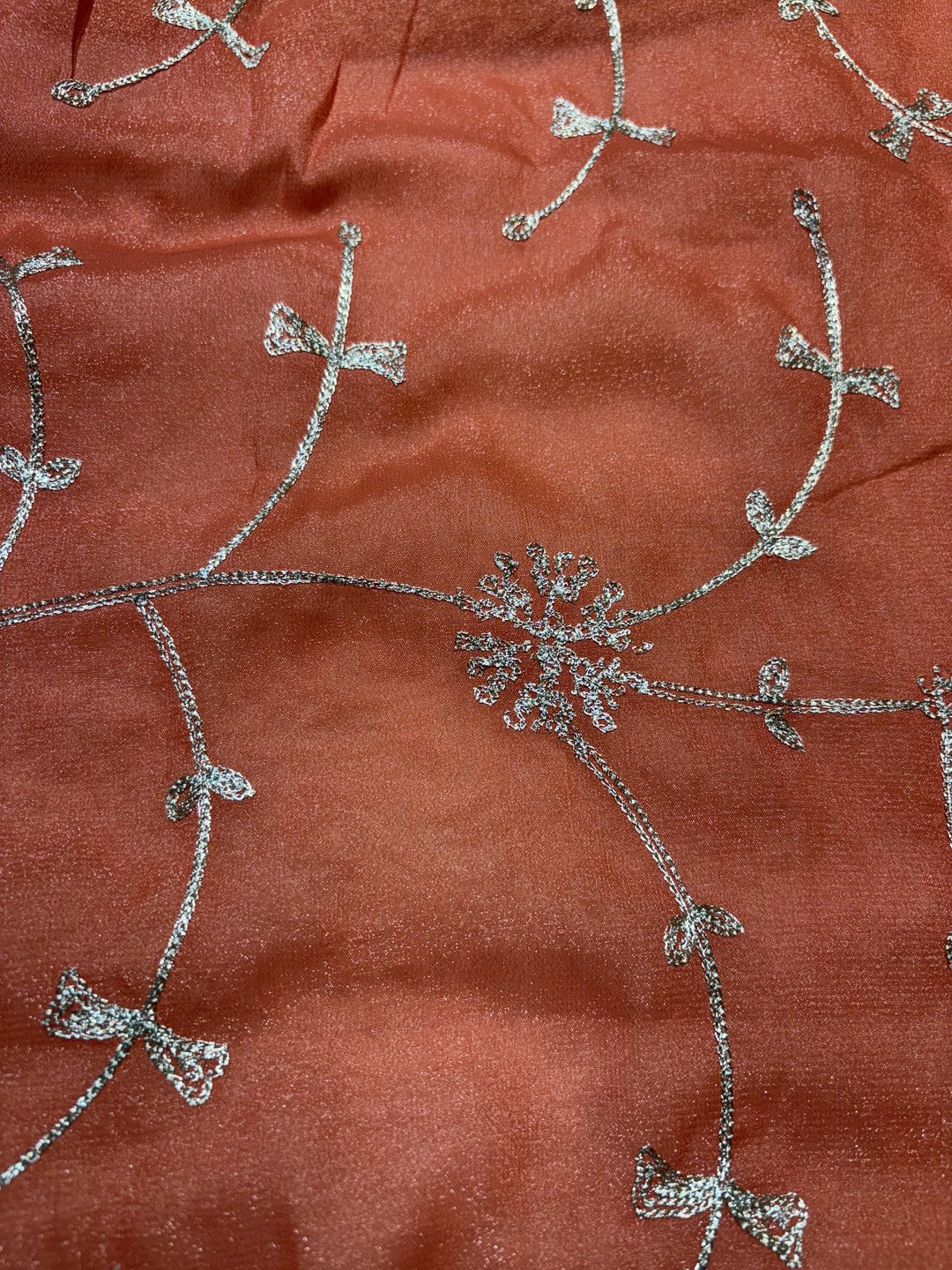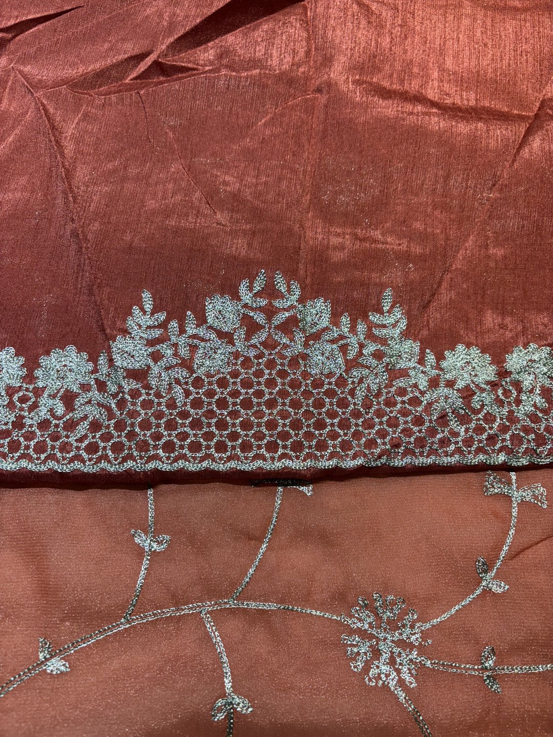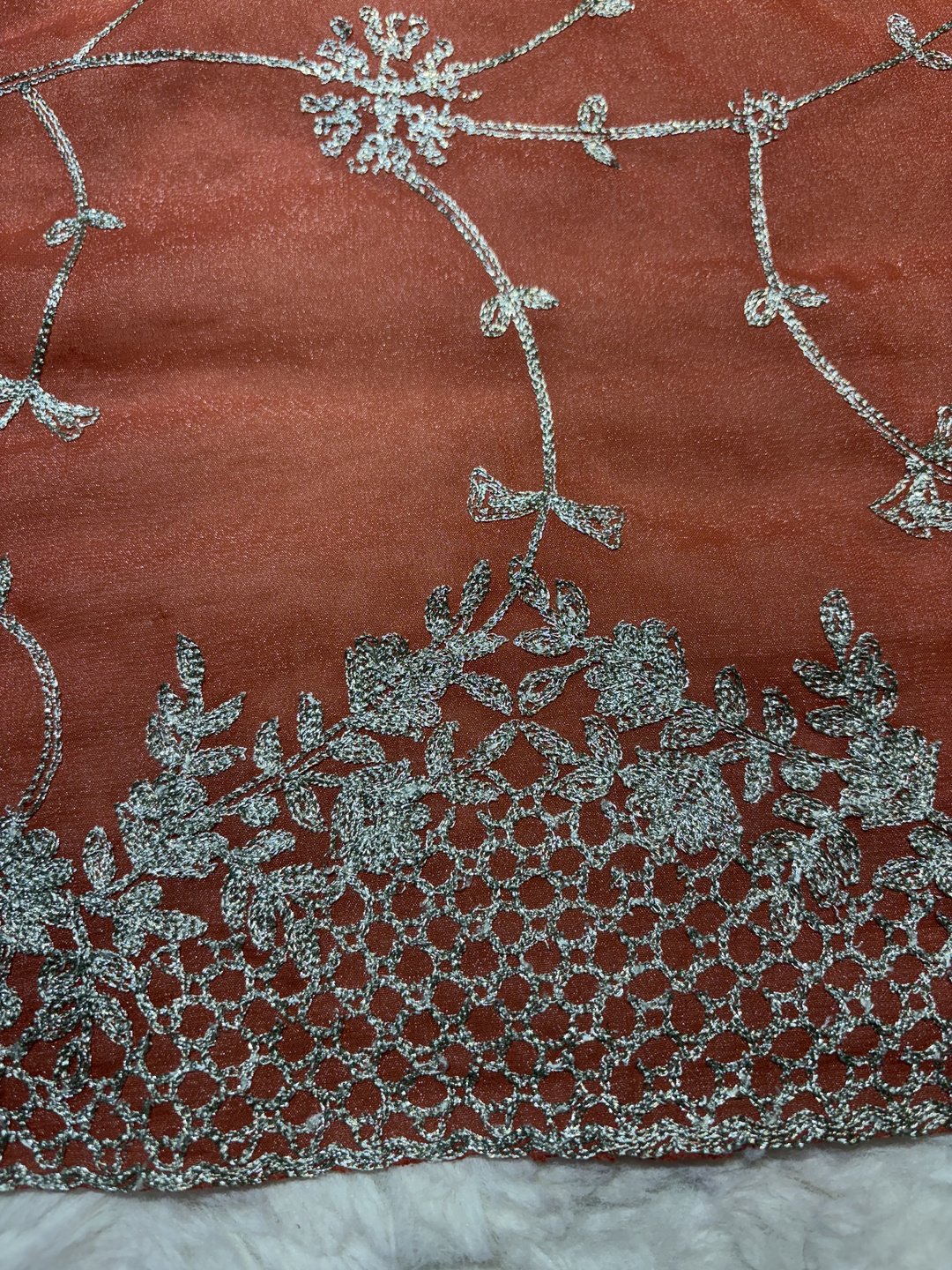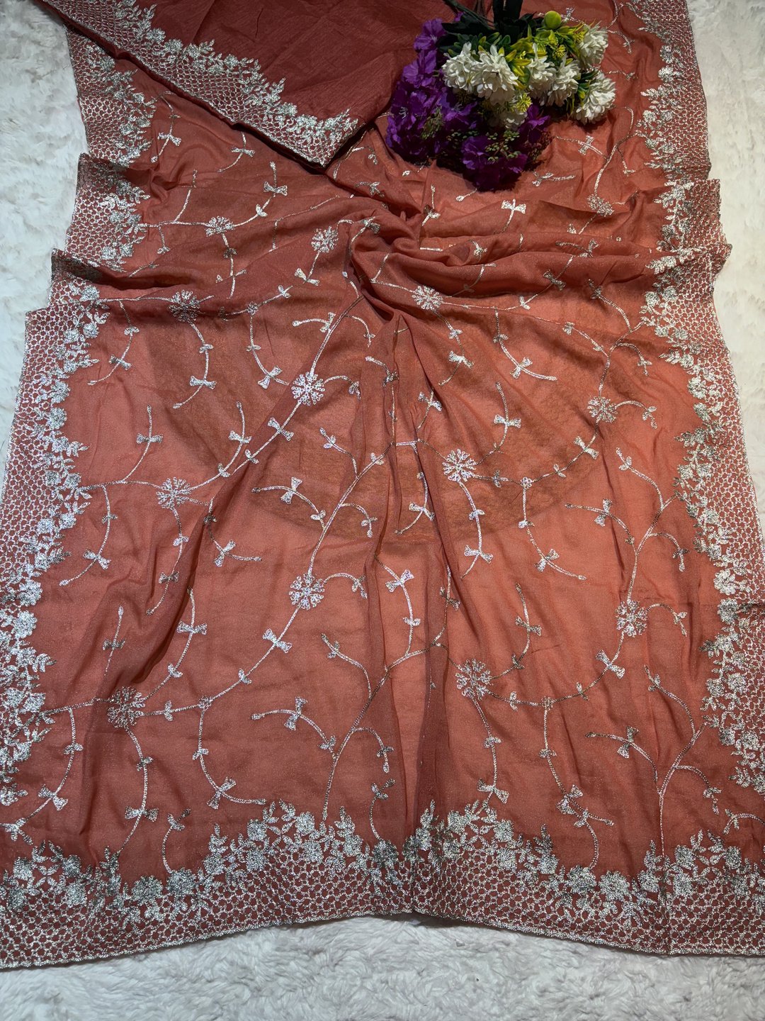 A stunning fusion of artistry: Intricate trending Zaal work enhances the soft, flowy fabric, creating a richly detailed drape that feels elegant, festive, and effortlessly luxurious.