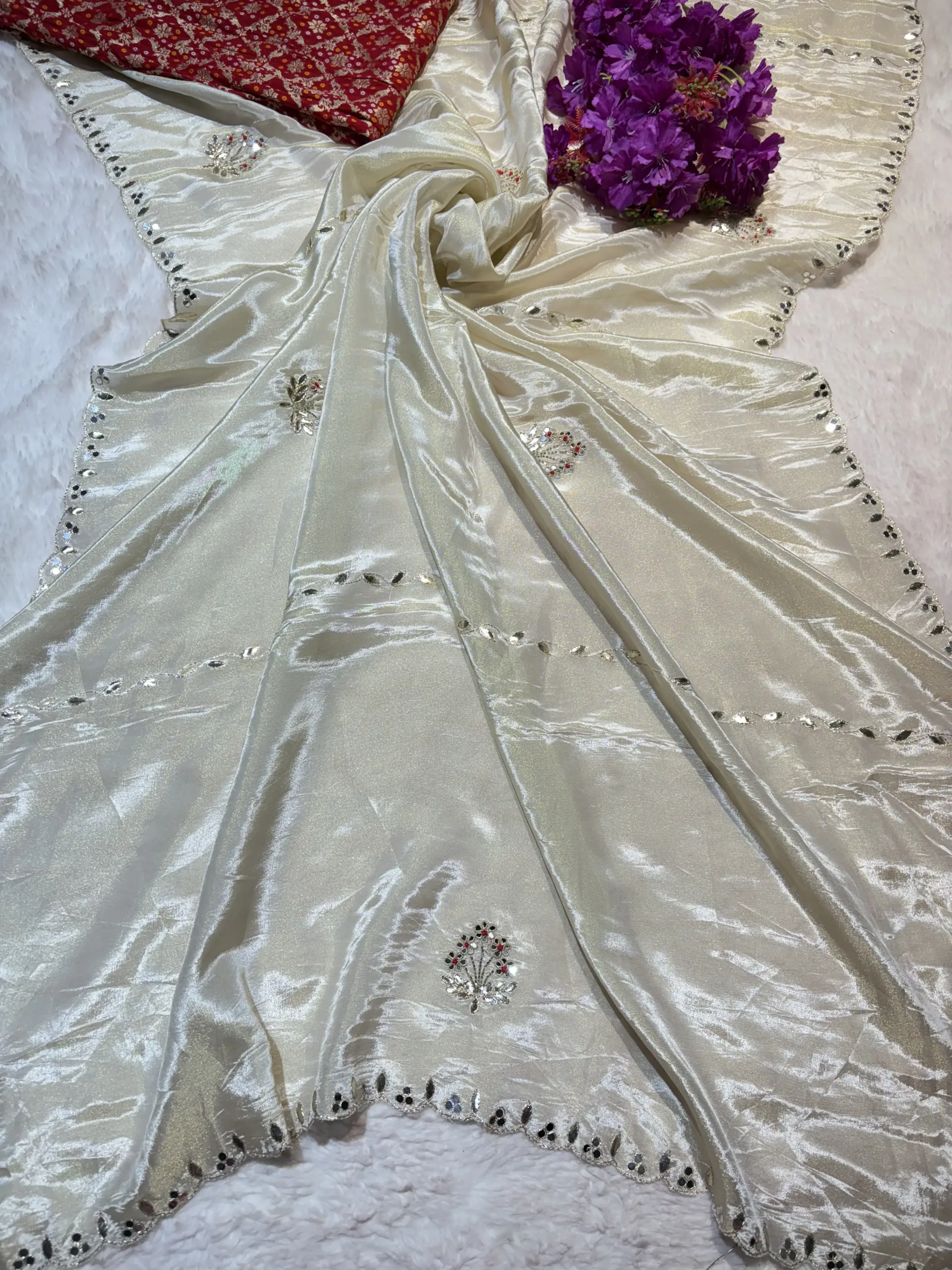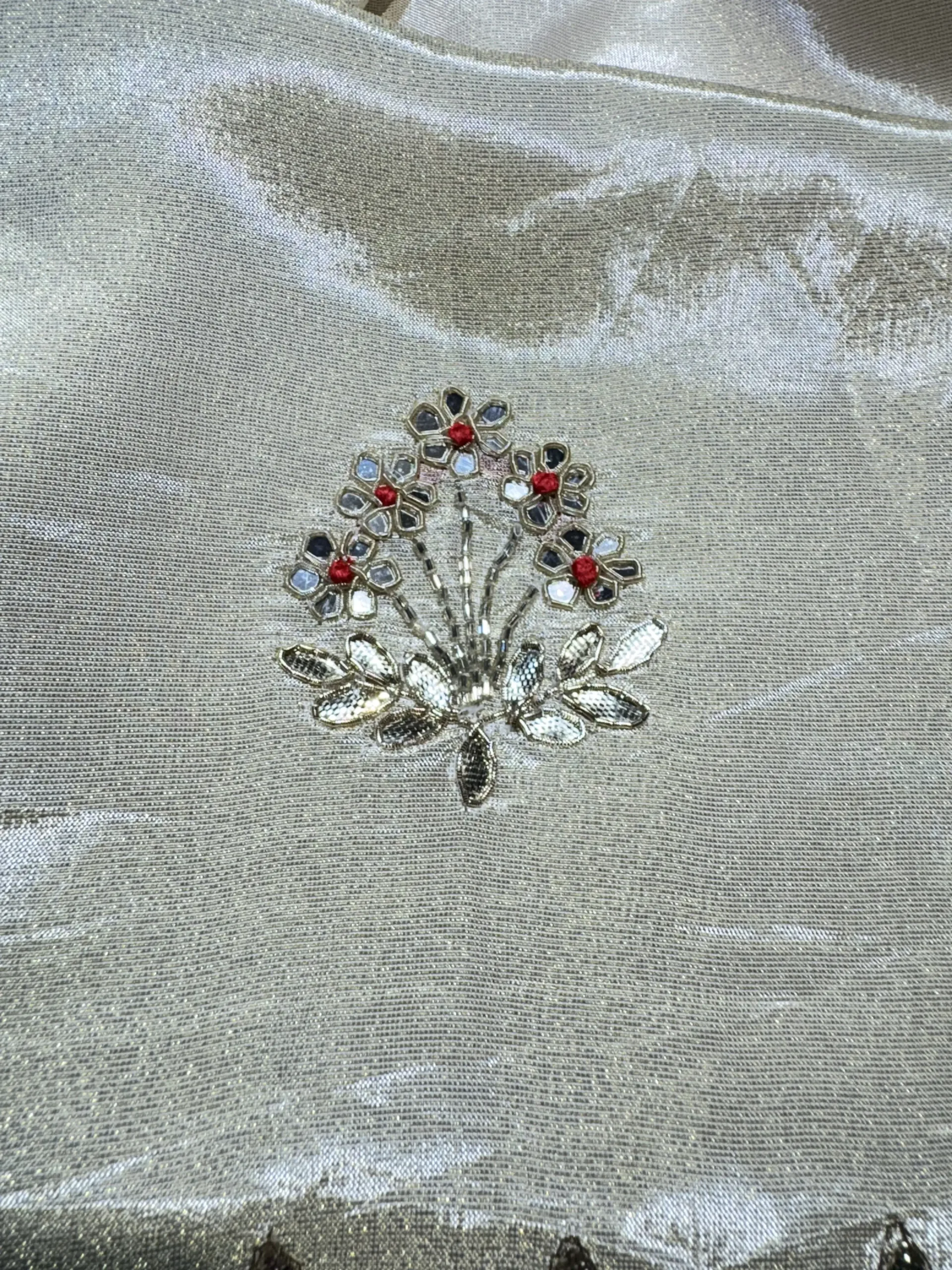 The inherent texture of the Tusser Silk is beautifully enhanced by meticulous Hand Gota Patti Work—the traditional technique of stitching small, folded sections of metallic ribbon onto the fabric. The Gota Patti is strategically applied, often forming delicate floral buttas, geometric borders, or intricate Jaal (net) patterns across the pallu or along the edges. The shimmering metallic work contrasts exquisitely against the muted, natural sheen of the Tusser Silk, creating a truly rich, celebratory aesthetic.