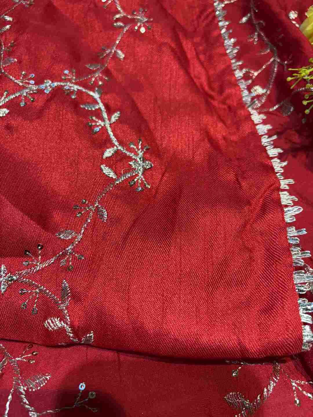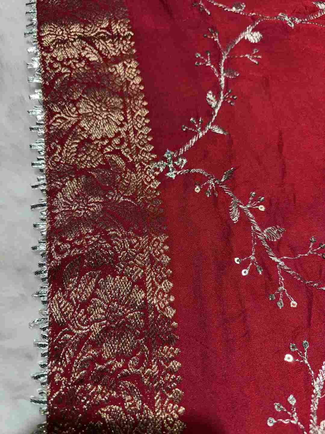 A stunning fusion of artistry: Intricate Zaal work paired with a distinctive Chit pallu elevates the richness of Russian Silk fabric, creating a graceful, festive drape that feels elegant, refined, and effortlessly luxurious.