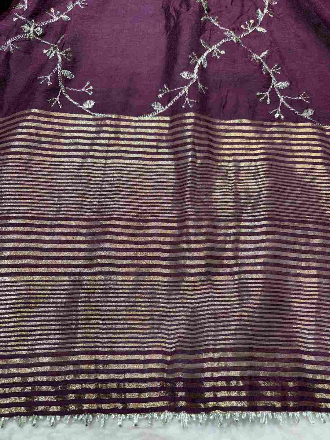 A stunning fusion of artistry: Intricate Zaal work paired with a distinctive Chit pallu elevates the richness of Russian Silk fabric, creating a graceful, festive drape that feels elegant, refined, and effortlessly luxurious.