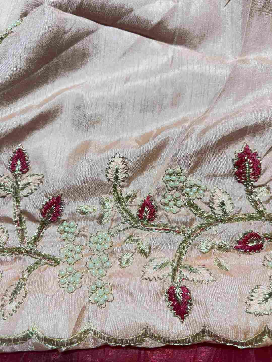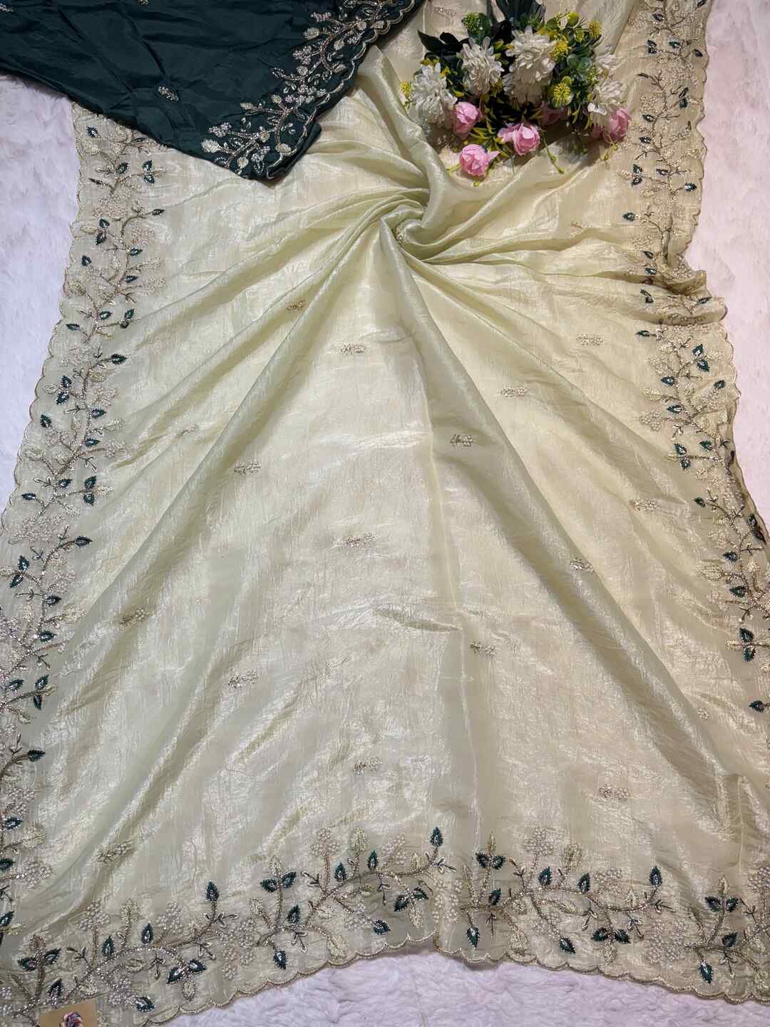 A stunning fusion of artistry: Rich Zardozi embroidery adorns the elegant Crust Tissue fabric, creating a shimmering, regal drape that feels opulent, festive, and effortlessly luxurious.