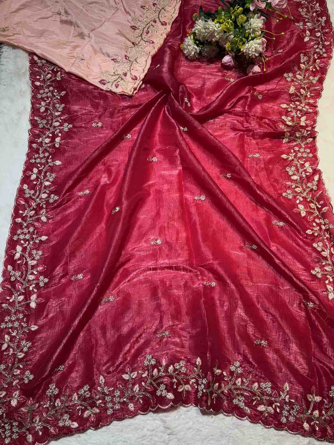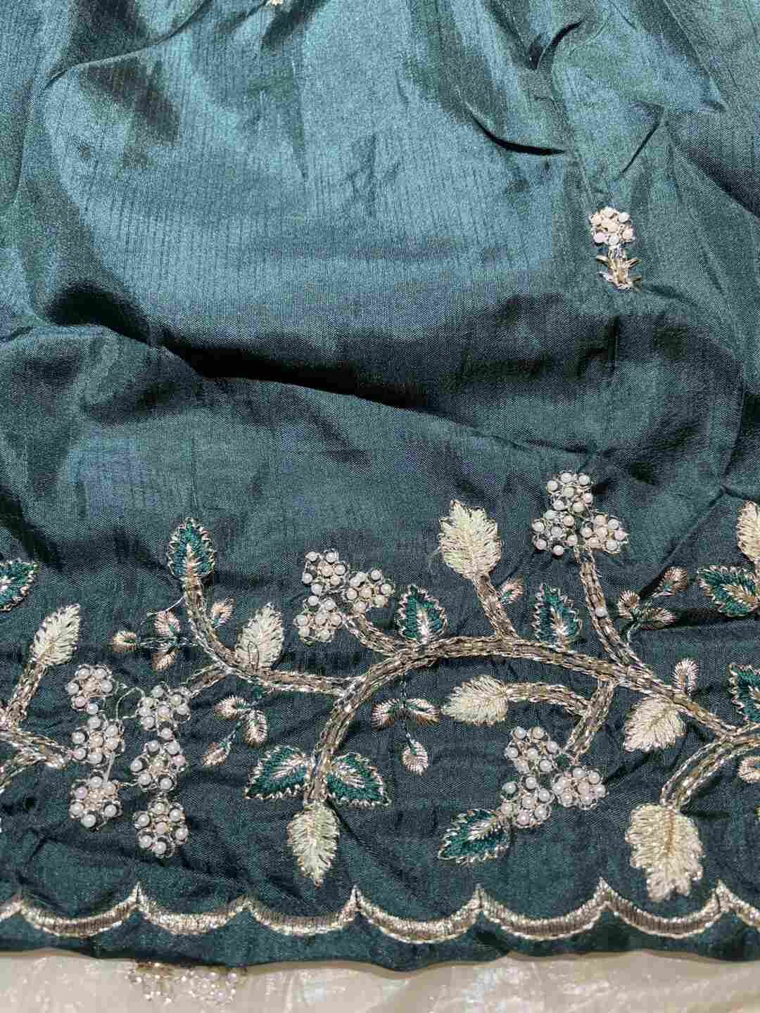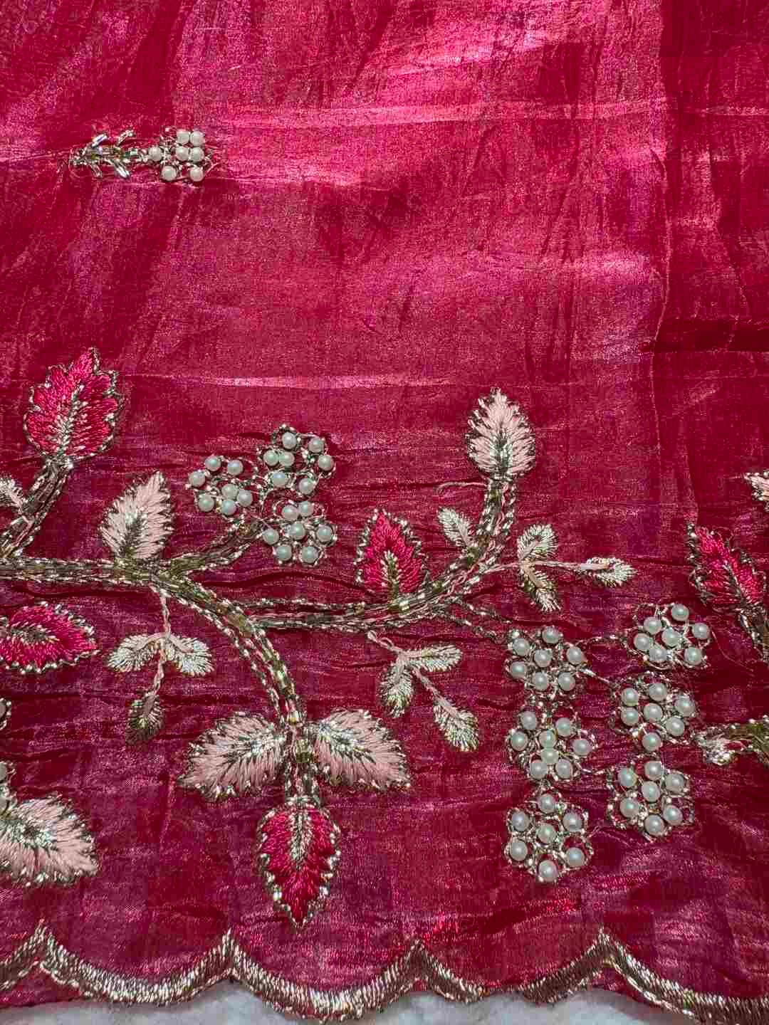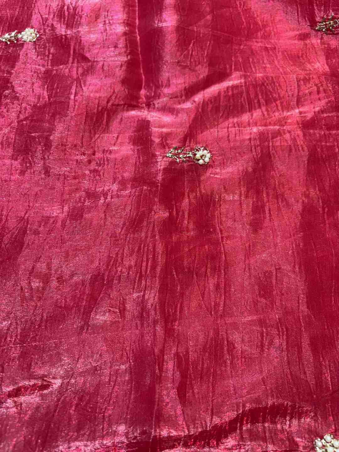 A stunning fusion of artistry: Rich Zardozi embroidery adorns the elegant Crust Tissue fabric, creating a shimmering, regal drape that feels opulent, festive, and effortlessly luxurious.
