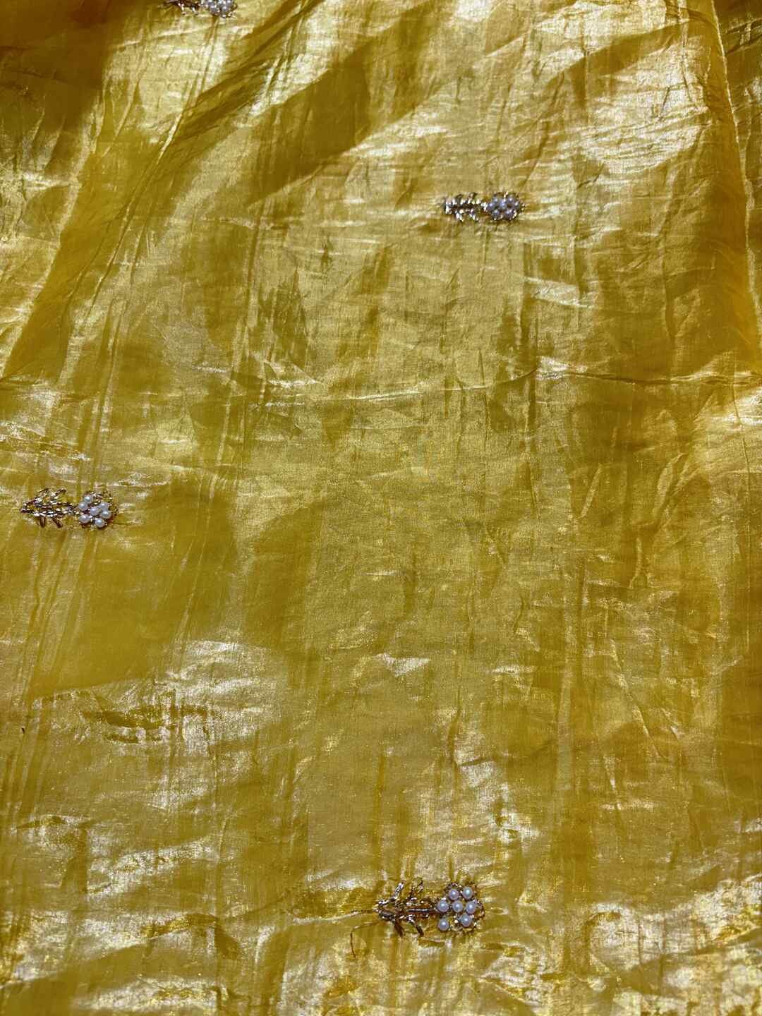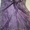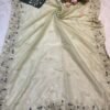 A stunning fusion of artistry: Rich Zardozi embroidery adorns the elegant Crust Tissue fabric, creating a shimmering, regal drape that feels opulent, festive, and effortlessly luxurious.